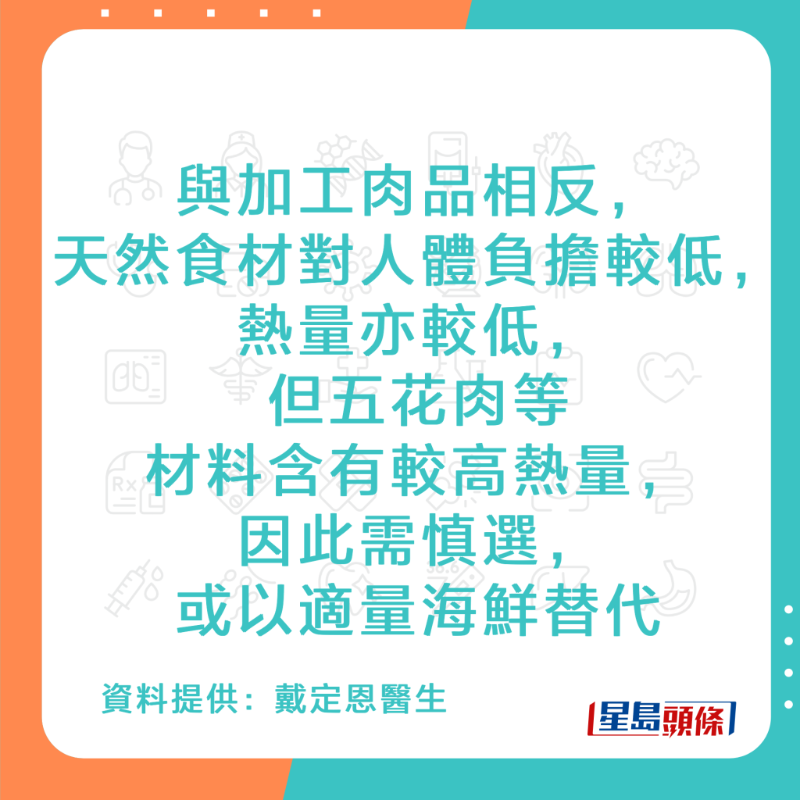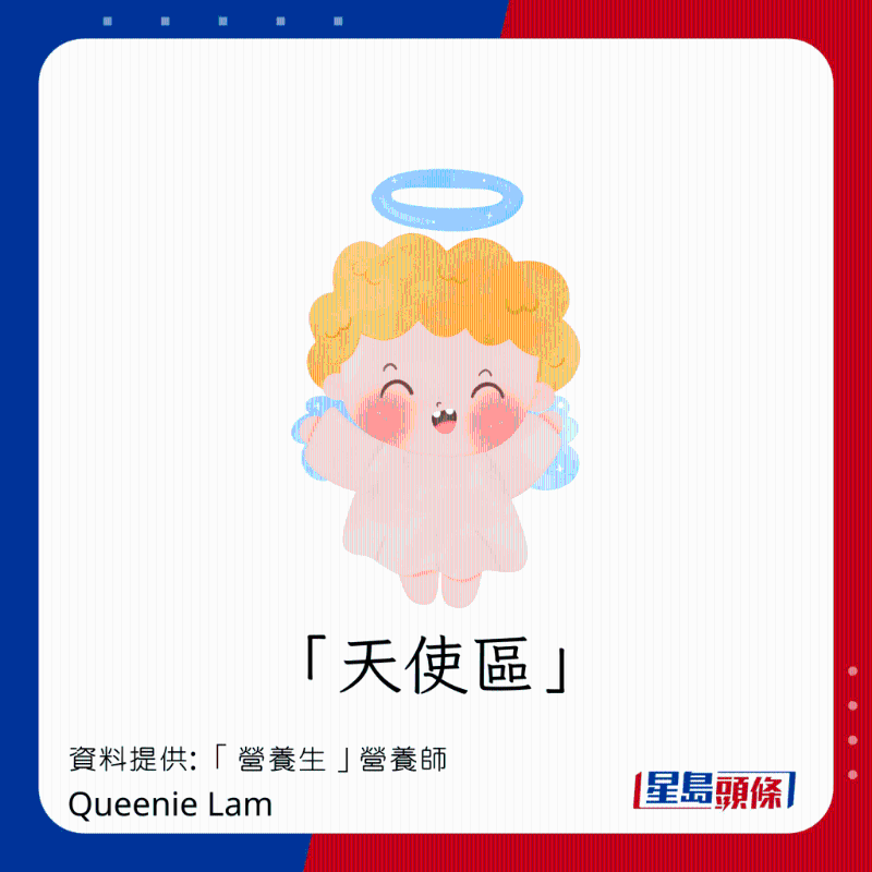 Queenie補充指“天使區”的低脂蛋白質均含有人體必需氨基酸,多攝取有助促進新陳代謝及新細胞形成。而“警號區”及“邪惡區”是加工食物為主,更影響蛋白質于小腸吸收,因此建議減少攝取。最后,她建議可以選較少添加劑、不經油炸及非包餡類別的丸類,可避免因多重加工食品而加重肝臟排毒負擔。