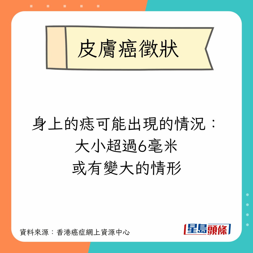 香港癌癥網上資源中心指,不同種類的皮膚癌有不同的征狀,比較常見的征狀包括以下9種: