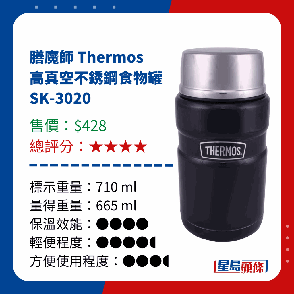 “膳魔師Thermos”高真空不銹鋼食物罐SK-3020($428)