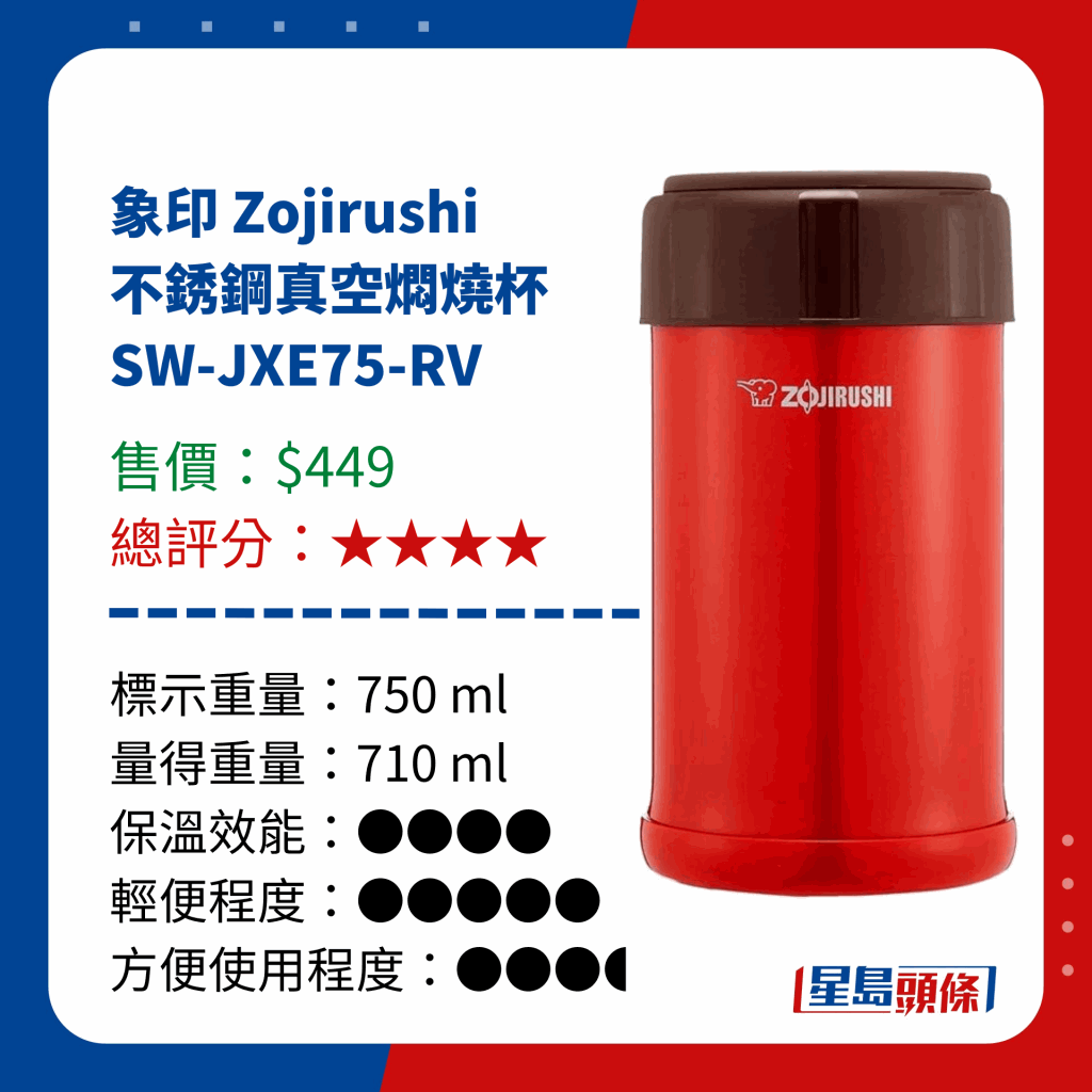 “象印Zojirushi”不銹鋼真空燜燒杯SW-JXE75-RV($449)