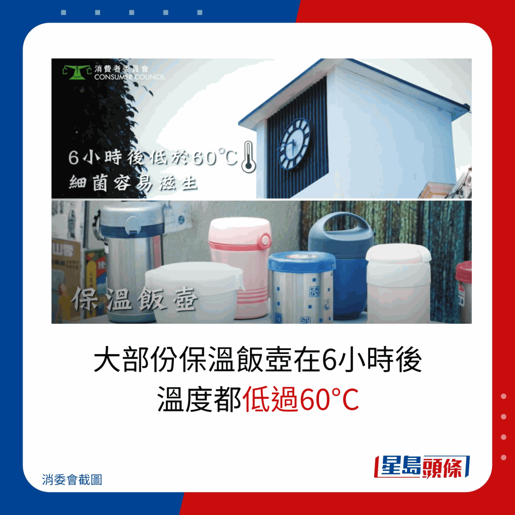 消委會燜燒壺保溫飯壺測試|近日“活力午餐”意外頻生,突然停派飯令家長要臨急抱佛腳,趕買保溫飯壺為小朋友預備午餐,亦令家長更關注食安問題。早前消委會測試 15 款燜燒壺及保溫飯壺,發現其中 2 款樣本的6小時保溫效能低于 50℃。消委會提醒,熱食的存放溫度應高于 60°C,而冷食則應低于 4°C,以免細菌容易繁殖,增加食物安全的風險。