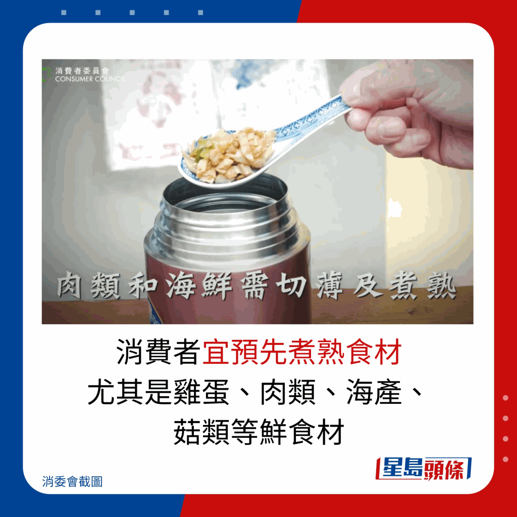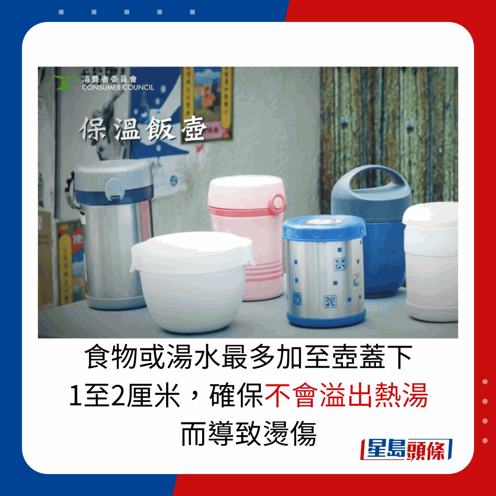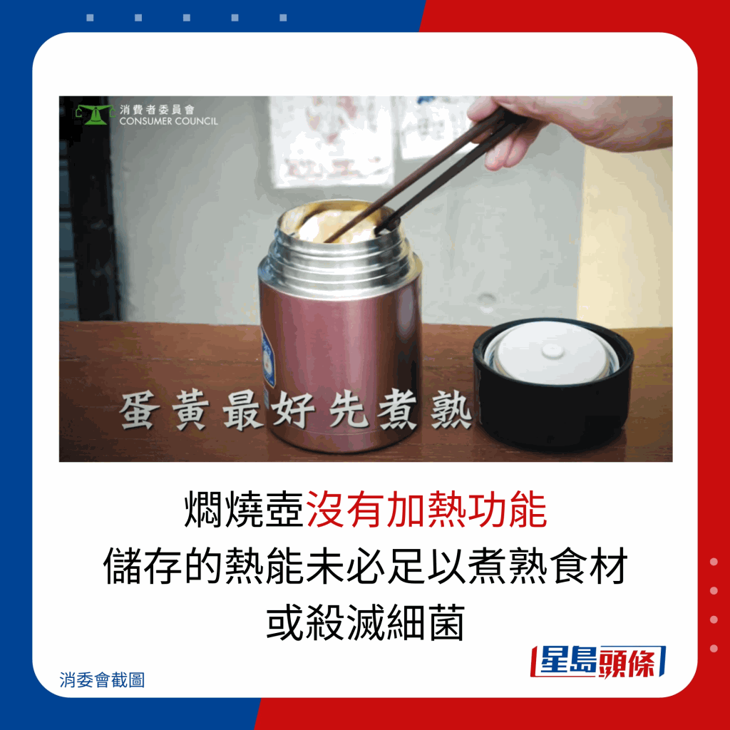 消委會提醒市民,大部份保溫飯壺在 6 小時后,溫度都低過 60°C,最好在 6小時內盡快食用。即使未能一次吃完,也不應保留稍后再吃,以避免食物安全風險。另外燜燒壺沒有加熱功能,消費者宜預先煮熟食材,尤其是雞蛋、肉類、海產、菇類等生鮮食材,才放入壺內繼續燜焗。