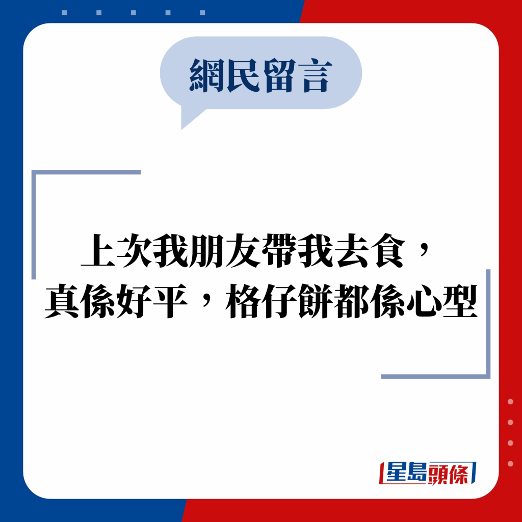 心形雞蛋仔的可愛造型收穫網民一致好評,有網民指“第一次見到心形的”、稱“心形好靚,好特別!讓人覺得開心又幸福的感覺”、“唔貴又得意,謝謝好推介”。