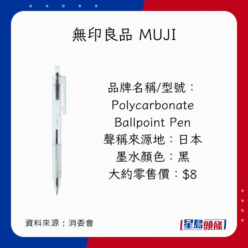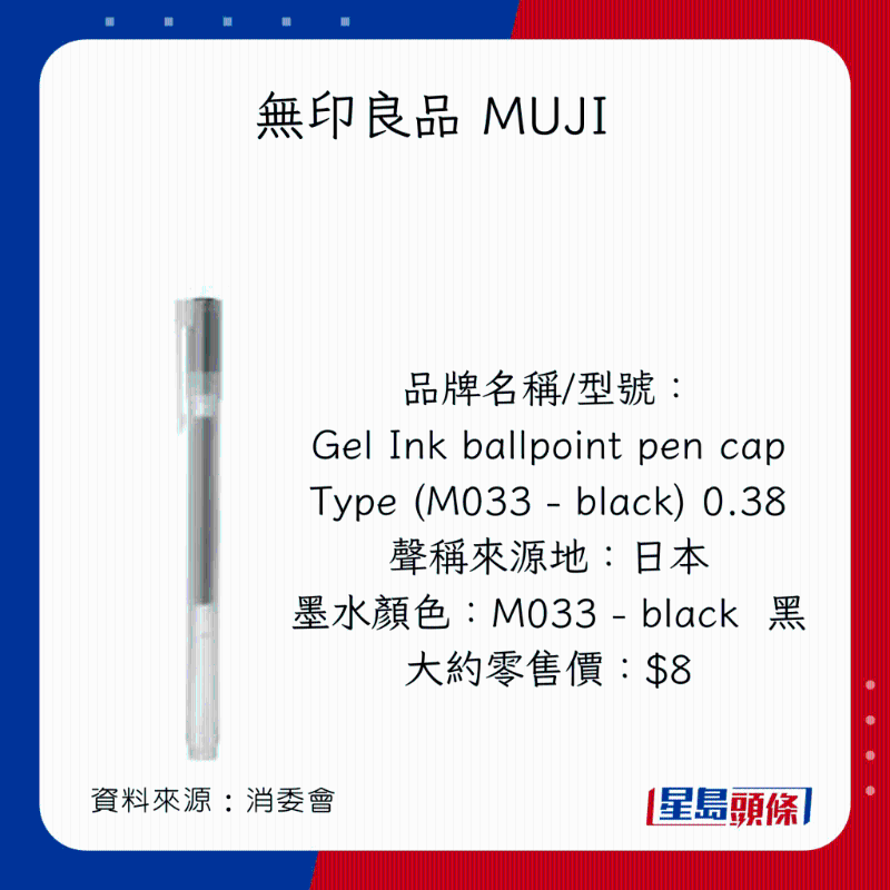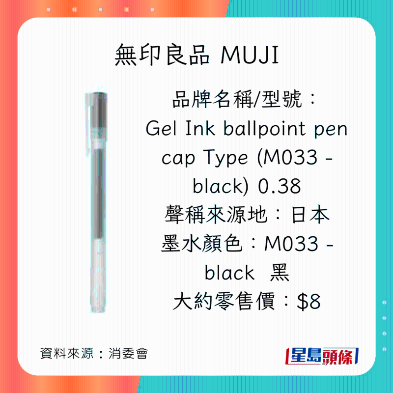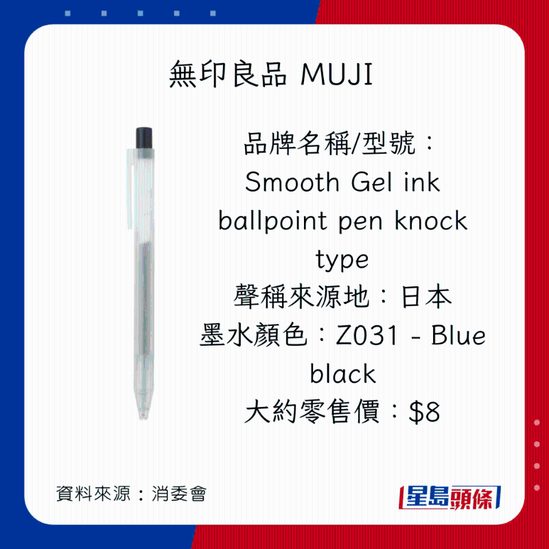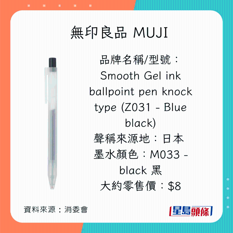 消委會早前調查市面上40款,價格由$2.4至$86不等的原子筆啫喱筆,包括18款原子筆(ballpoint pens,又稱油墨圓珠筆),以及22款啫喱筆(gel ink pens,又稱中性墨水圓珠筆)。墨水顏色方面,22款為黑色;15款為藍色;以及3款為藍黑色。35款屬按壓式型號;余下5款則為揭蓋式型號。