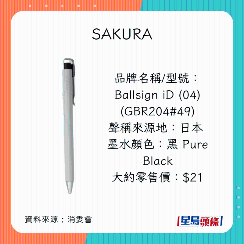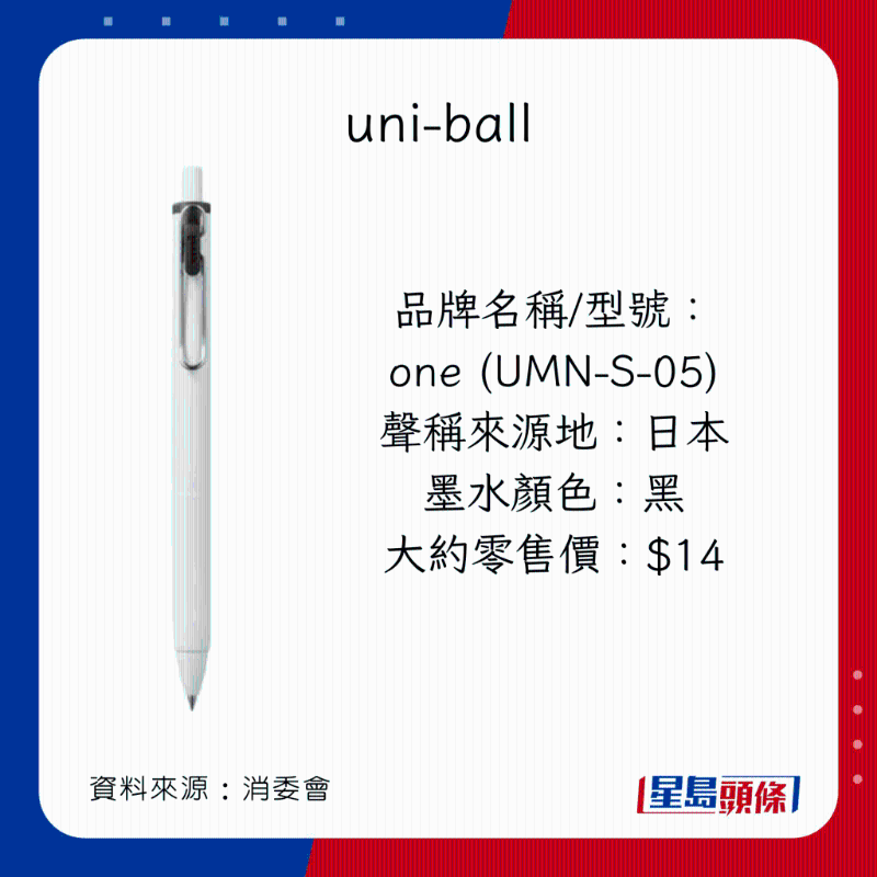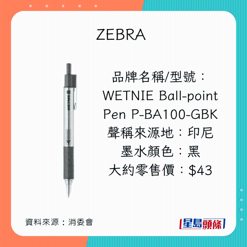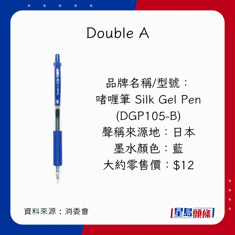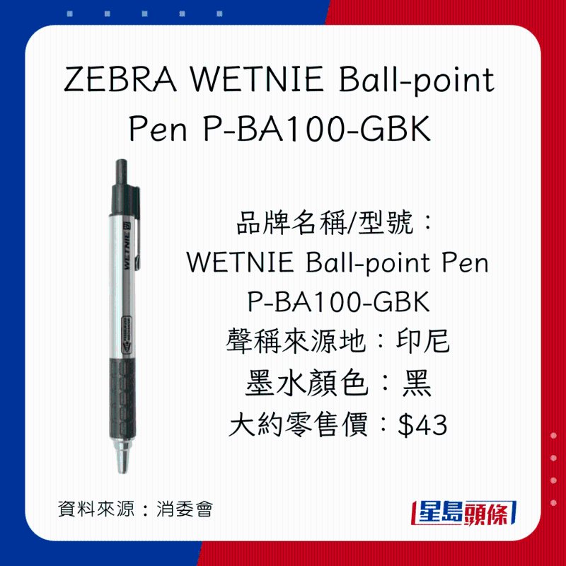 消委會早前調查市面上40款,價格由$2.4至$86不等的原子筆啫喱筆,包括18款原子筆(ballpoint pens,又稱油墨圓珠筆),以及22款啫喱筆(gel ink pens,又稱中性墨水圓珠筆)。墨水顏色方面,22款為黑色;15款為藍色;以及3款為藍黑色。35款屬按壓式型號;余下5款則為揭蓋式型號。