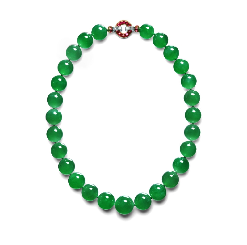 ▲項鏈??ǖ貋啺屠?,1934年。翡翠、鉑金、金、鉆石、紅寶石。特別訂制,卡地亞典藏。來源:芭芭拉.赫頓(1912–1979年),美國零售商伍爾沃斯百貨繼承人。Marian G&eacute;rard, Collection Cartier ?Cartier