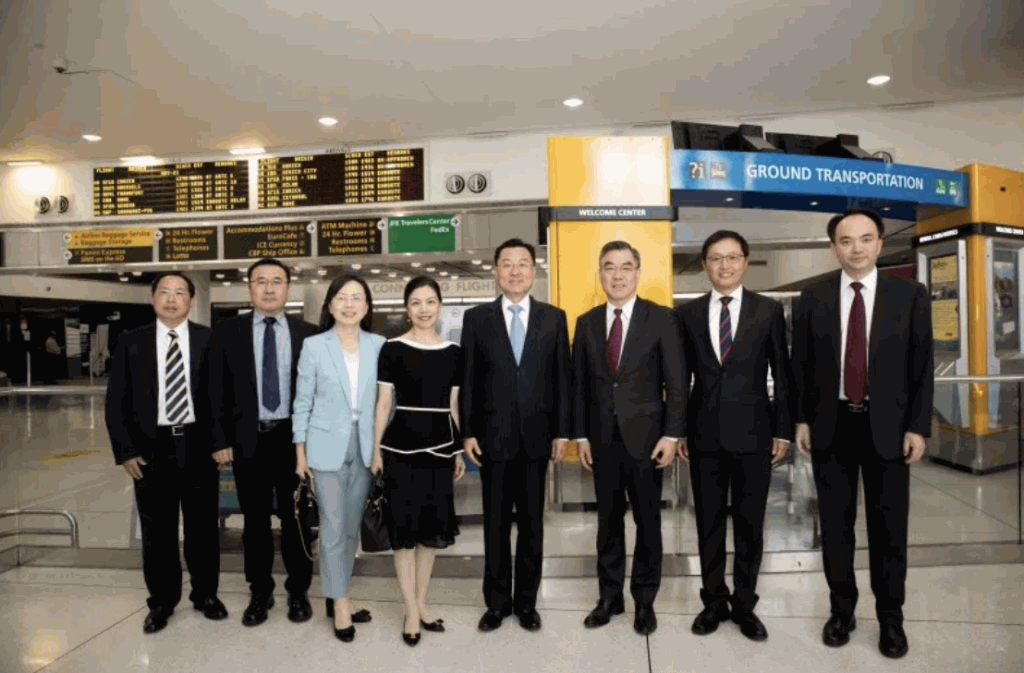 ▲中國駐美公使徐學淵(左三)和中國駐紐約總領事黃屏(右三)到機場迎接候任大使謝鋒(右四)。謝鋒推特