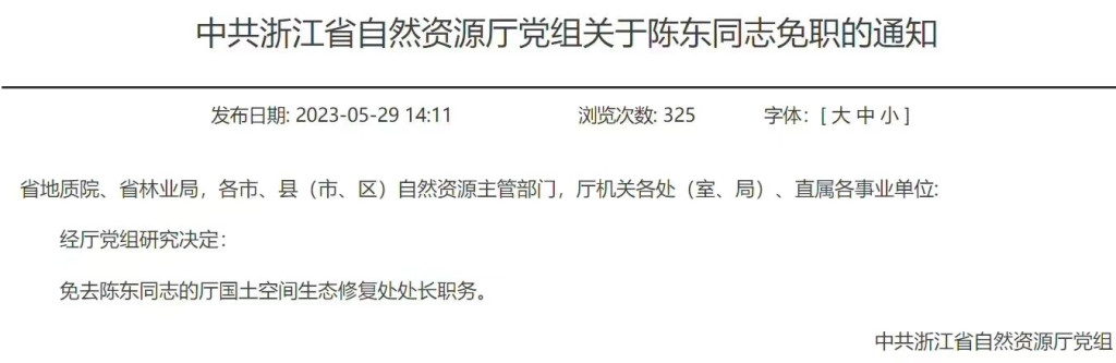 5月29日,浙江省自然資源廳官網發布一則通知稱,經廳黨組研究決定:免去陳東同志的廳國土空間生態修復處處長職務。