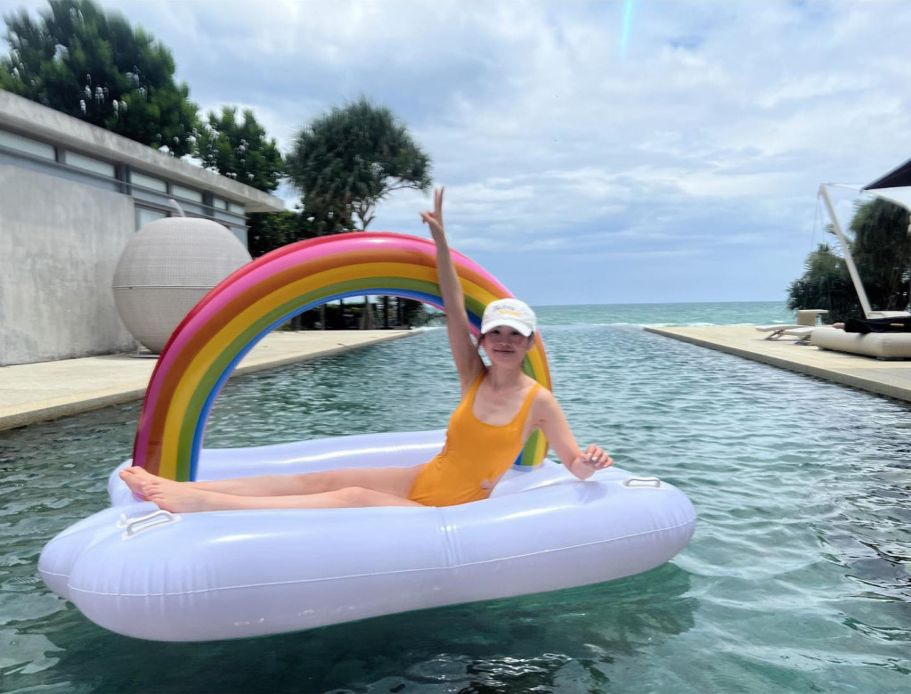 ▲阿Sa躺在彩虹浮床上舉V手勢。