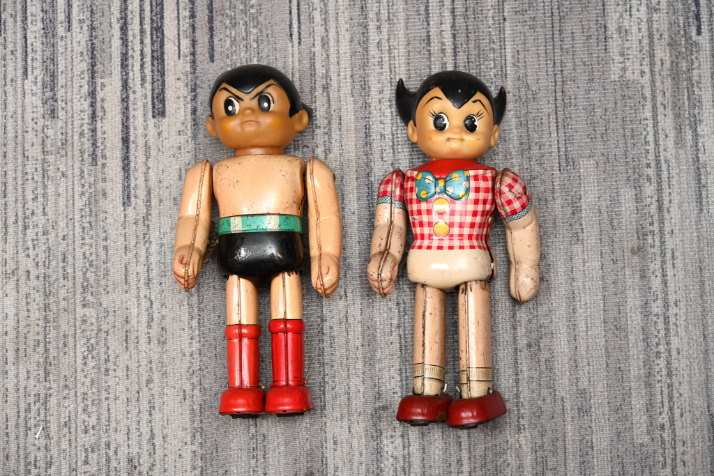 ▲鐵皮公仔來自1960年代,屬古董玩具,是盧詠欣收藏多年的珍品。