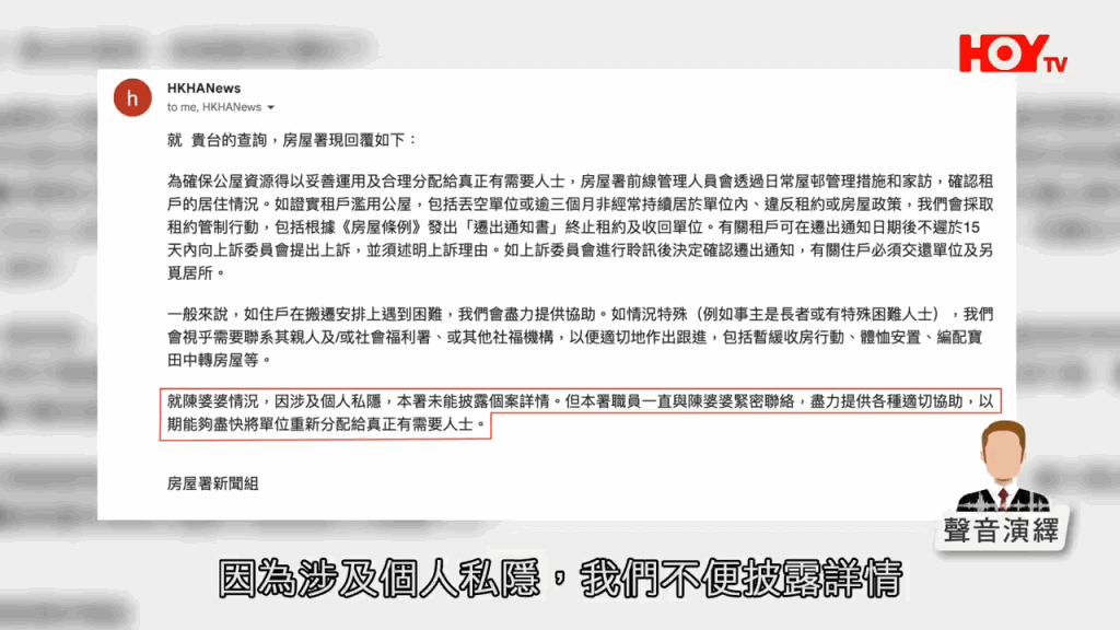 就陳婆婆情況,房屋署表示,因涉及個人私隱,署方未能披露個案詳情,但該署職員一直與陳婆婆緊密聯絡,盡力提供各種適切協助,以期能夠盡快將單位重新分配給真正有需要人士。