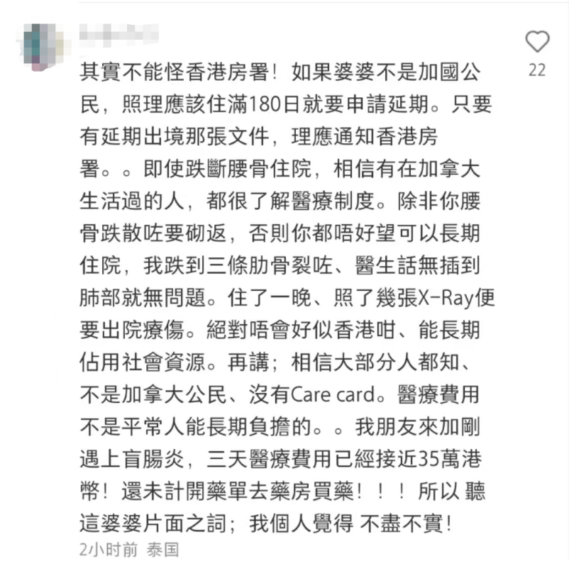 2.陳婆婆是否真的常住香港?有網友根據陳婆婆加拿大護照無出入境記錄、在醫療制度嚴格的加拿大住院許久等信息,分析認為陳婆婆很可能已經加入加拿大戶籍或拿了綠卡,因此護照上沒有出入境記錄,且很可能不是常住香港。網友紛紛認為阿婆占用公共資源,公屋應該給其他更需要的人。