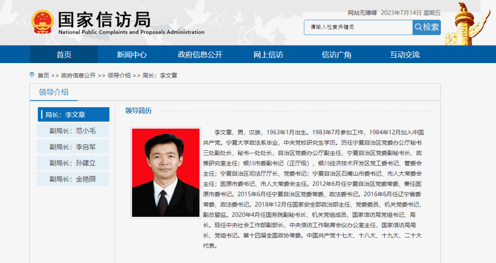 國家信訪局網站顯示,李文章已調任中央社會工作部副部長。