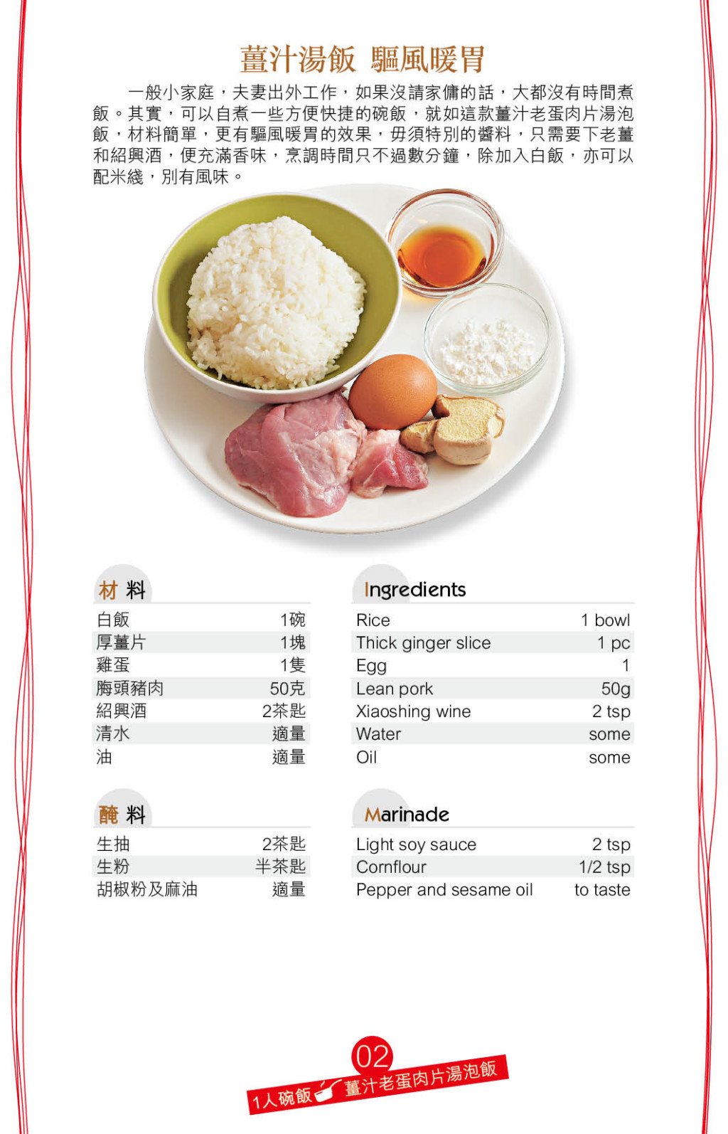 喜歡濃郁鮮味,一定要試“潮式吊片泡粥”; 所謂泡粥,其實與泡飯一樣,同樣在湯中加入白飯煮滾即可。 這道“潮式吊片泡粥”加入多款各具香味的材料煮湯,包括干濕魷魚、冬菇、冬菜、中國芹菜、芫荽碎,再配搭免治豬肉,煮好的湯水鮮味富層次。 帶一點客家姜酒蛋風味的“姜汁老蛋肉片湯泡飯”,用姜米及紹興酒煎蛋,加入腌過的脢頭肉煮湯,入口帶姜與酒的香氣,特別醒胃。 想吃清爽一點的味道,推介日式的“梅干魚松綠茶泡飯”,先用日本腌漬梅干、橄欖油浸沙甸魚做成飯團,將飯團置碗中,加入海苔飯素及芝麻,再注入泡好的綠茶,吃時伴點青芥末,口感鮮爽不膩。