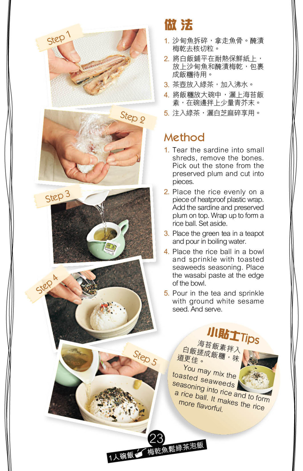 將飯團置碗中,加入海苔飯素及芝麻,再注入泡好的綠茶,吃時伴點青芥末,口感鮮爽不膩。