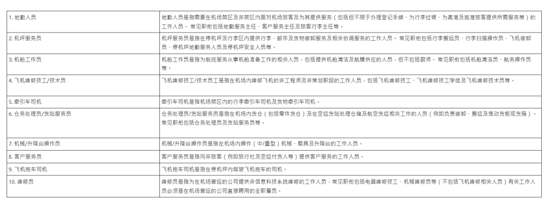 計劃涵蓋以下10種前線非管理級機場員工﹕地勤人員;機坪服務員;機艙工作員;飛機維修技工/技術員;牽引車司機;倉務處理員/貨站服務員;機械/升降臺操作員;客戶服務員;飛機拖車司機;維修員。計劃招聘人員上限為6300人。