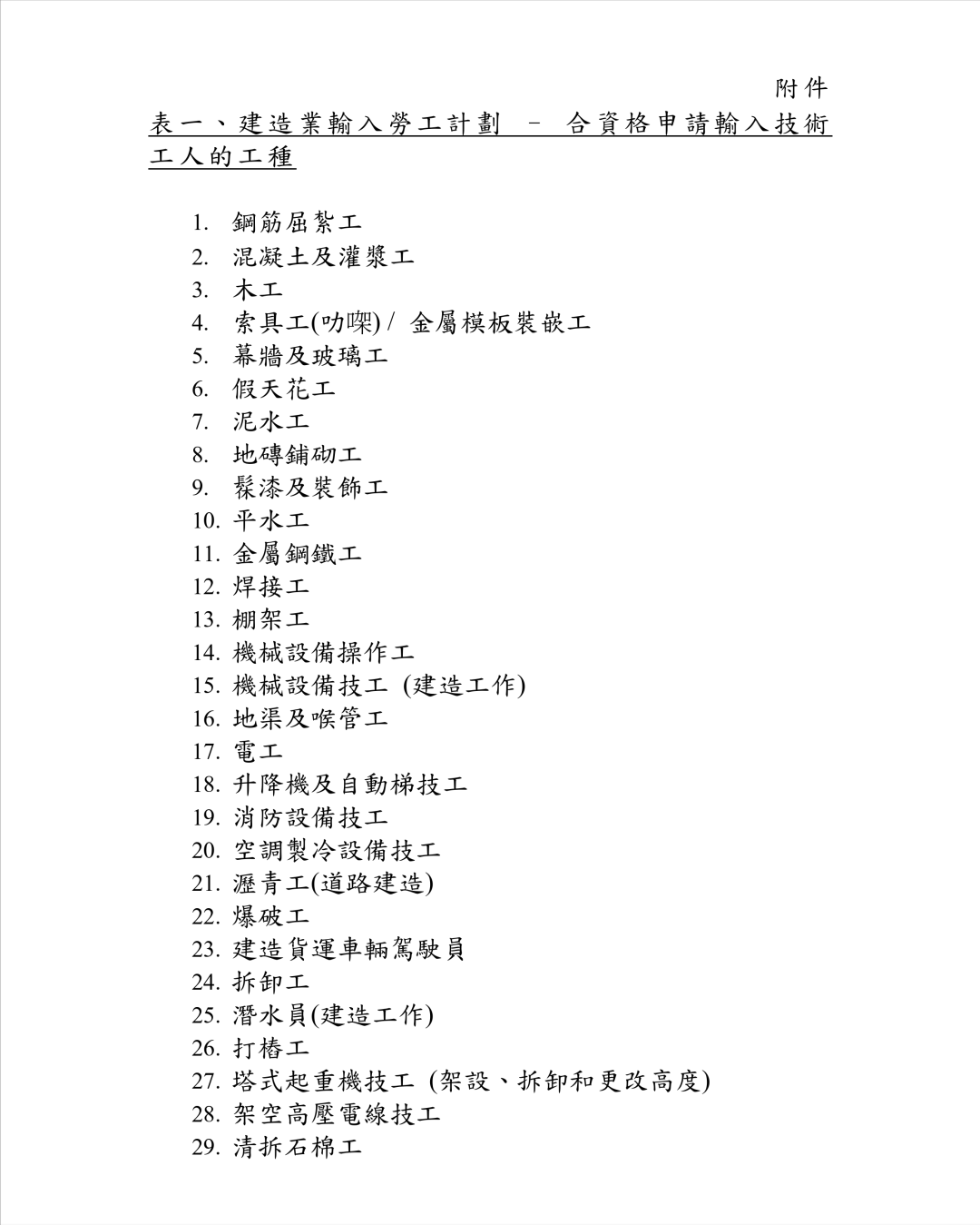 建造業外勞涉及29個工種的技術工人,涉及職位則有18個,預料建造業外勞最快第四季來港。