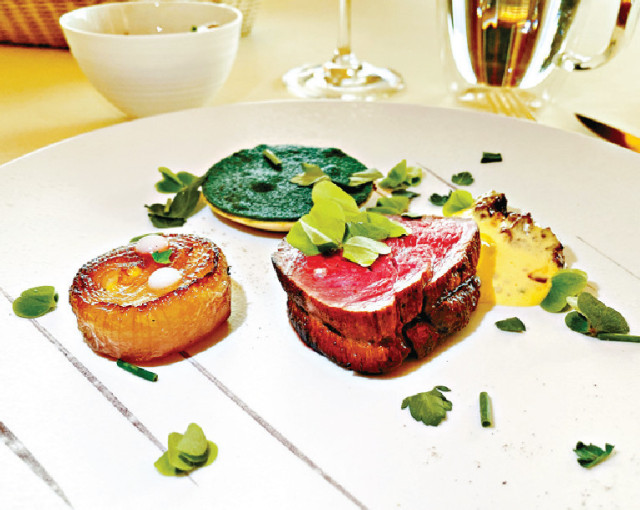 至于主菜Boeuf fou d'herbs沿用肉味香濃的法國Charolais草飼牛肉眼扒入饌,肉質鮮美而鮮嫩可口,用時醮上滑順豐厚而附香草芳香的Bearnaise醬汁提味;隨附的法國Roscoff紛紅洋蔥微甜雅緻,迷你香草脆皮撻則散發Mushroom Duxelles香菇泥層的風味。
