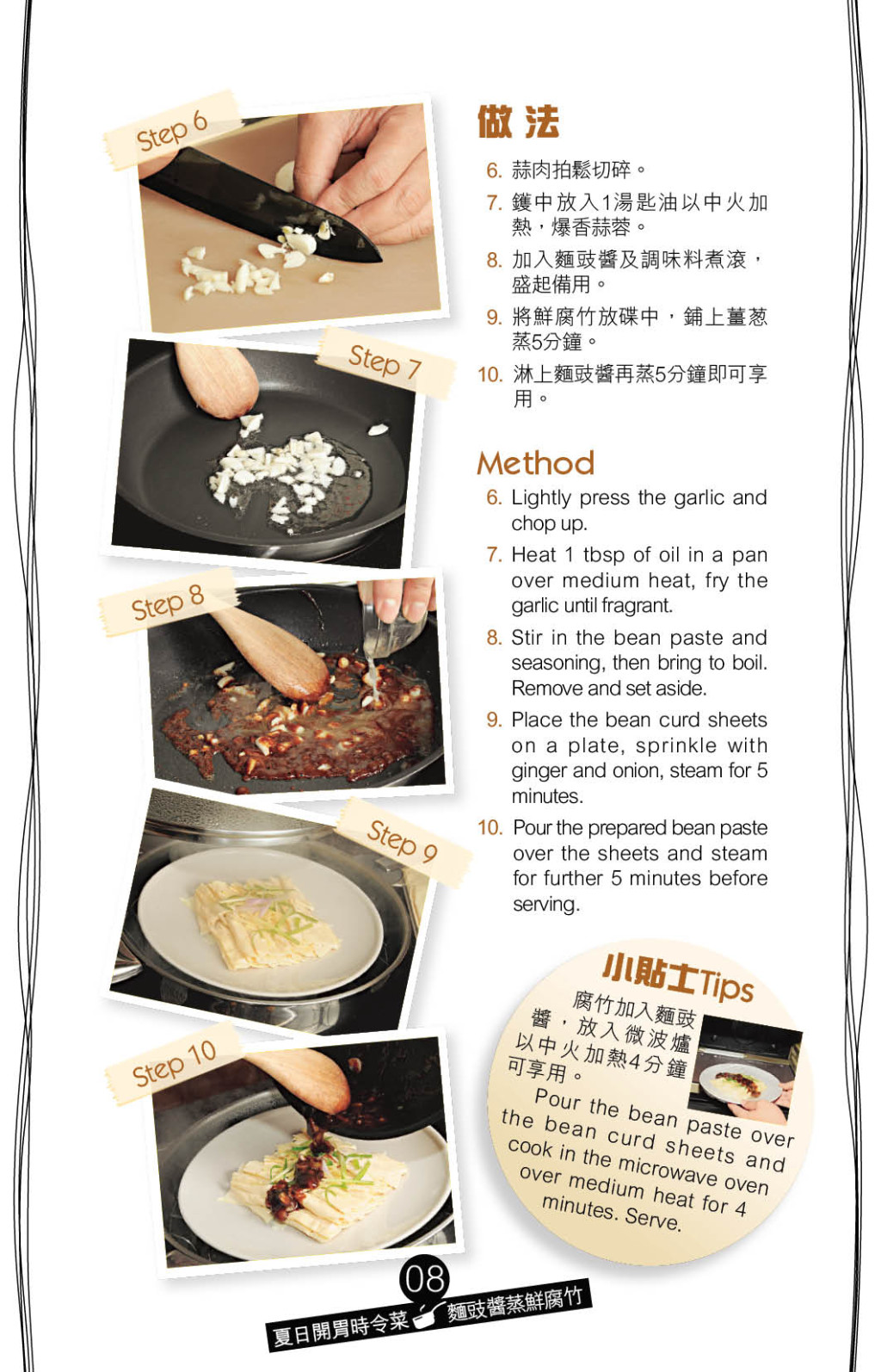 鮮腐竹豆味香濃,口感滑溜清爽,最適合夏天食用。這道“麵豉醬蒸腐竹” 選用在街市有售的鮮腐竹制作,豆味特別濃郁。簡單炮香薑和蒜,加入麵豉醬及調味料煮成醬汁,伴蒸腐竹吃,入口鮮香清爽。