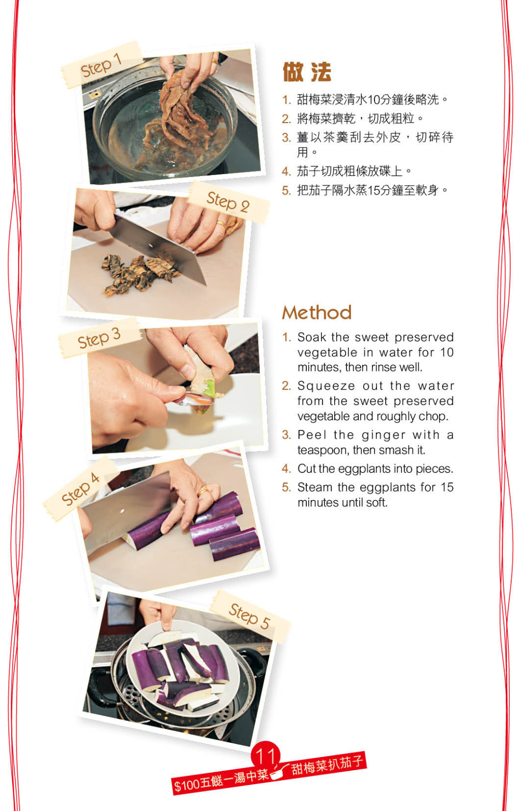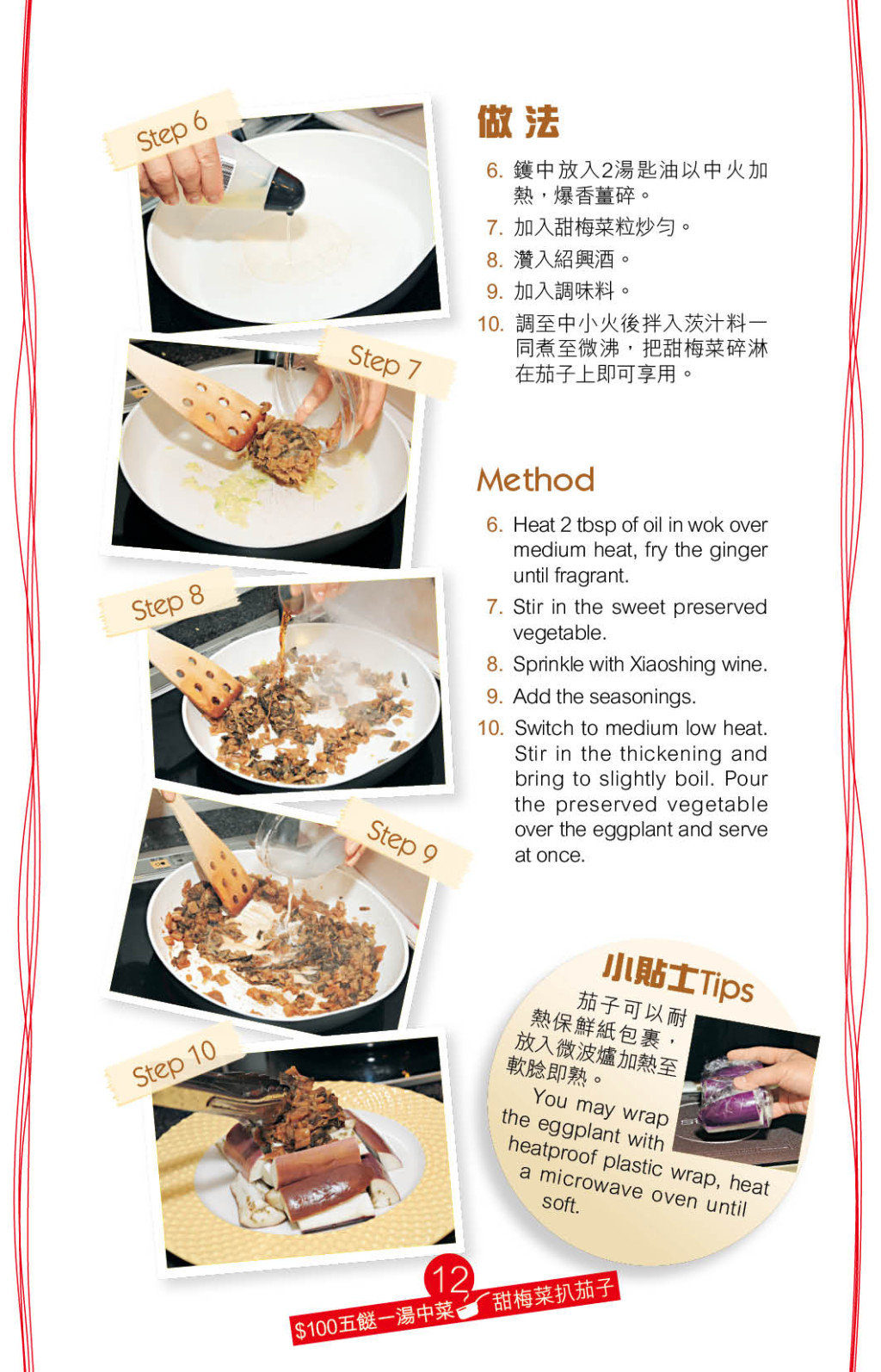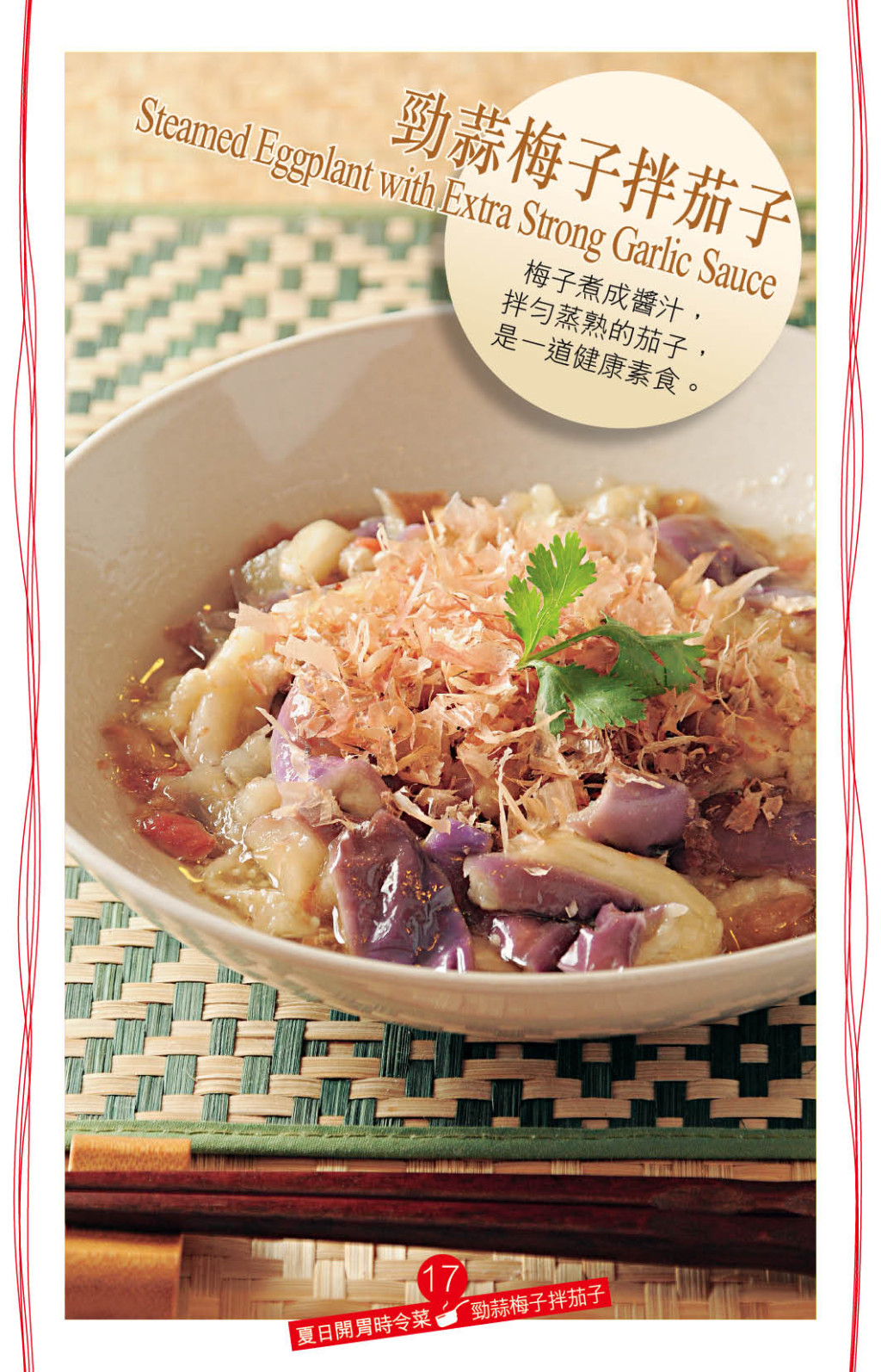 兩款蒸茄子分別以中式及日式方法炮制。中式的“甜梅菜扒茄子 ”,建議選用甜梅菜入饌,烹調前浸泡梅菜片刻,減少咸味,并加入糖、酒、麻油吊味煮成醬汁,淋在清淡蒸茄子上。日式的“勁蒜梅子拌茄子”加入了蒜頭、醃梅子、日本木魚碎及日本冷麵醬汁,味道更鮮美有層次,充滿和風滋味。