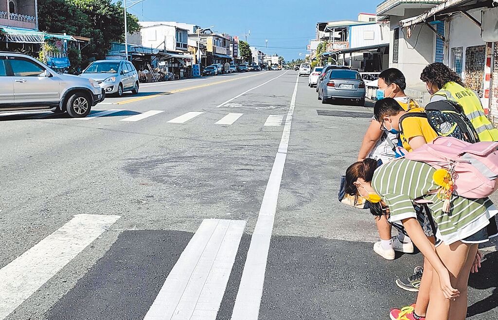 ▲臺東縣信義小學老師帶領學生過馬路,在路口向左右停等的車輛敬禮。