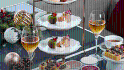 嘆美點兼享禮品的聯乘下午茶,向來受歡迎。如奕居Salisterra與TUMI合推的下午茶(兩位$680起,即日至9月30日),以后者首個鋁合金行李箱系列19 Degree為題,不但為客人炮制富夏日色彩的主題下午茶點,更為食客送上TUMI禮品。巧手下午茶咸點,包羅龍蝦配醃制檸檬及魚子醬、番茄凍批及雞油菌黑松露雞肉三明治等,款式配搭豐富。吸睛的下午茶甜點,備有焦糖慕絲白蘭地啫喱、白桃云呢嗱奶凍、多重士多啤梨窩夫撻及芒果椰子撻,另有3款水果冰茶,為下午茶帶來香甜滋味。