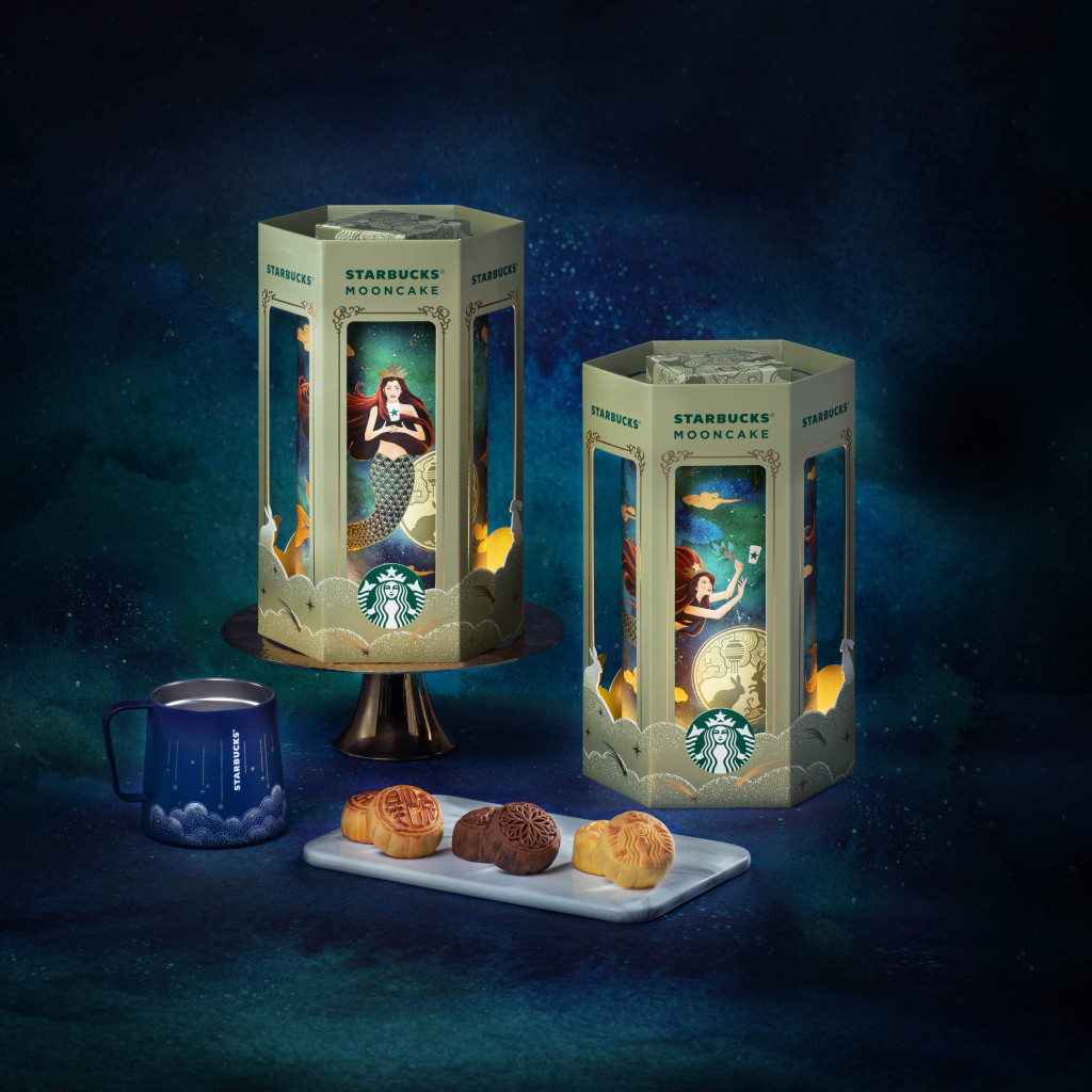 中秋節點亮花燈更添氣氛?!靶前涂嗽嘛灹凉庾唏R燈禮盒”以品牌標志美人魚,配搭中式走馬花燈造型,花燈還附燈光及旋轉設計,結合中西特色。月餅加入品牌咖啡茶飲為元素,創作了流心焦糖咖啡月餅、焙茶黑芝麻月餅、燕麥奶奶黃月餅三款創新口味,另每套禮盒附送一張中杯裝(354ml)手調飲品券。