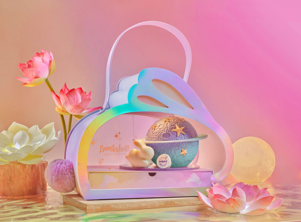 創意藝術糕餅店Bombshell聯乘國金軒為中秋節帶來夢幻月餅禮盒,這個“限量版花好月圓中秋節禮盒”以玉兔伴明月為創作靈感,造成流線的玉兔造型手提袋,配合夢幻童話色調、柔和燈光與皮制手挽,禮盒外形吸睛。月餅禮盒的另一亮點是Bombshell的限量版5吋花好月圓藝術甜點(Lotus Luna Bomb),以圓月、繁星及玉兔為主題,外層以白朱古力制成,內有多款以中秋節為題的限量糖果,包括迷你自制朱古力玉兔、粉紅小兔及花朵造型棉花糖、迷你朱古力Bonbon、繽紛Jelly Bean啫喱豆、M&M's朱古力豆及果汁軟糖等,外形夢幻可愛。月餅禮盒下格載著8件國金軒的奢華迷你奶皇月餅,以黃金比例調配的奶皇餡料綿滑甘香,配松化牛油皮,香濃美味。
