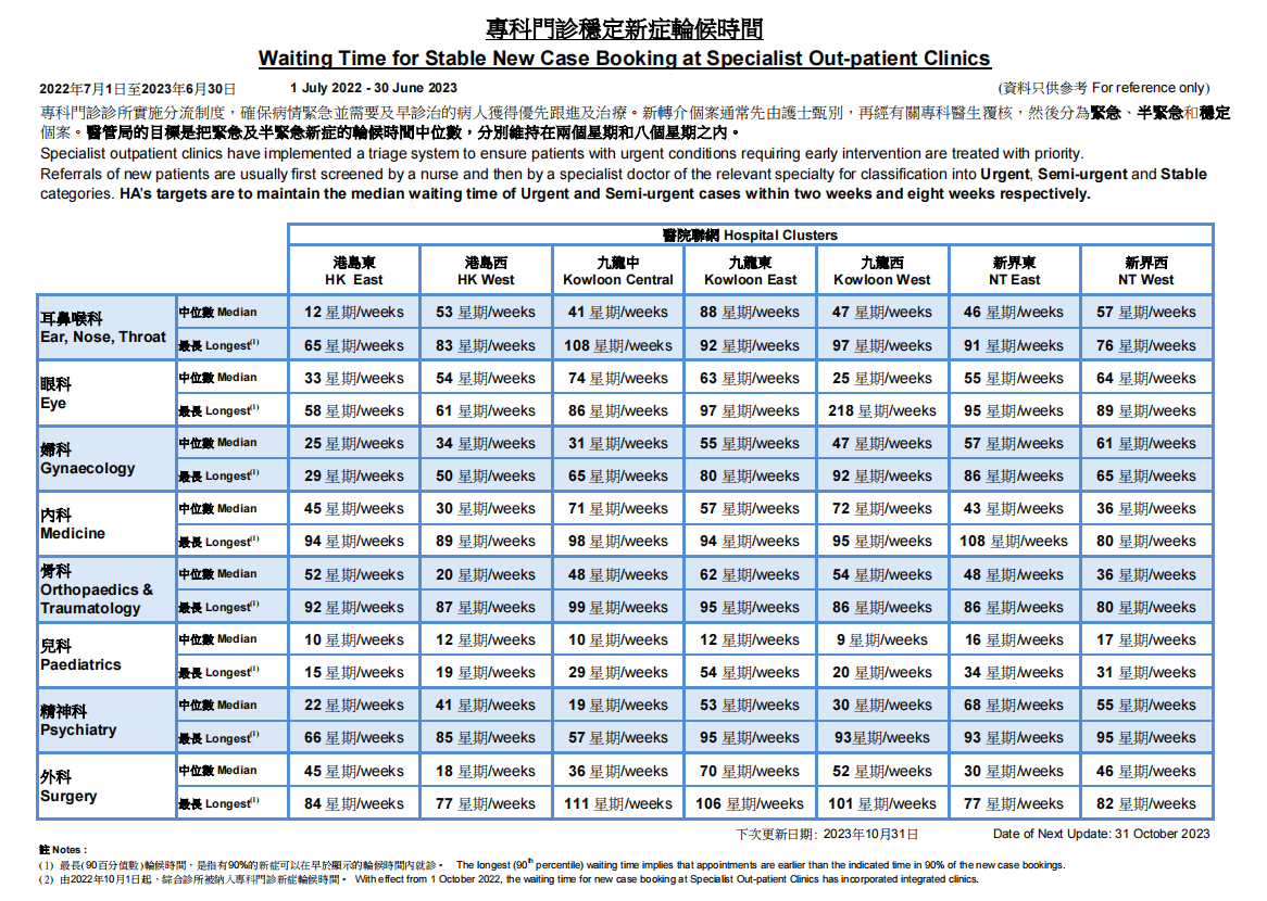 如上圖所示,香港醫管局將病例分為緊急、半緊急、穩定。緊急與半緊急的等候時間中位數分別在2周和8周之內。而新癥病例的等候時間則很久,最長需要等到218周,也就是4年多。