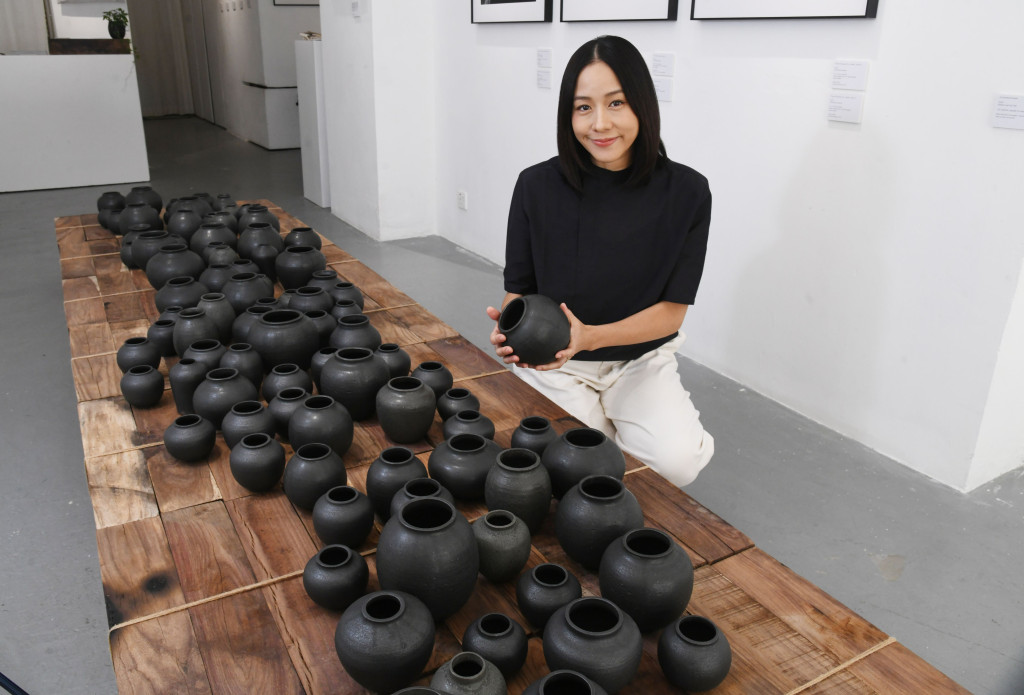 林嘉欣以一百件黑陶器皿,拼合成3米乘1米的裝置作品,猶像一道小河流。