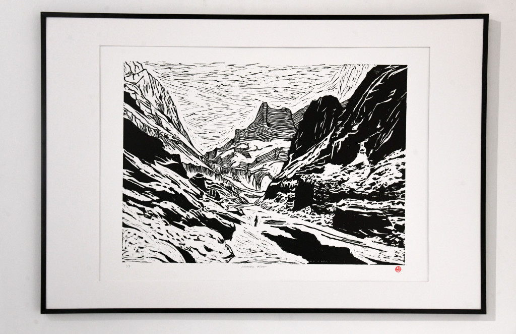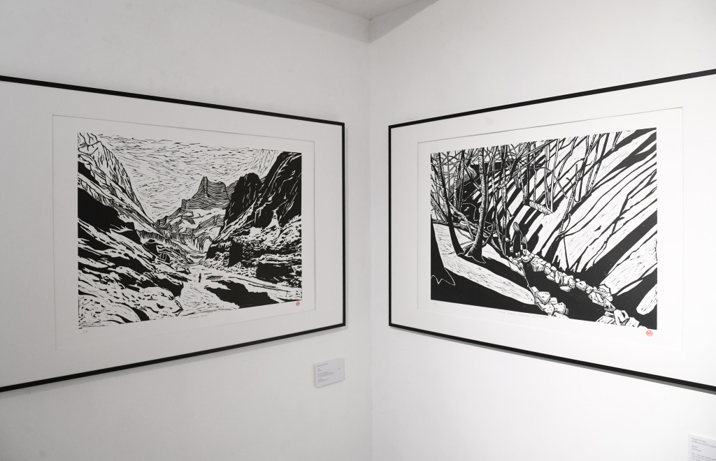 至于Cowrice的靈魂人物Philip和Grace,不但是嘉欣的好朋友,原來他們跟阿揚亦早已相識,更曾是鄰居。談及版畫跟照片的呼應,Grace便為今次特別創作的三幅大型版畫作解說。她指三幅作品好比詮釋著過去、現在與未來,當中呈現出一份微妙的聯系,就像一道源頭在北印度的河流,流經不同地域,把他們曾經生活的香港,以及當下生活的英國連結起來。第一幅畫作是把阿揚的一幅冰川的攝影作品制作成版畫,第二幅作品則勾畫了Grace跟女兒在英國的時候,經常會行經居所附近河畔的情景。第三幅作品則描繪在香港行山時所見的景貌。