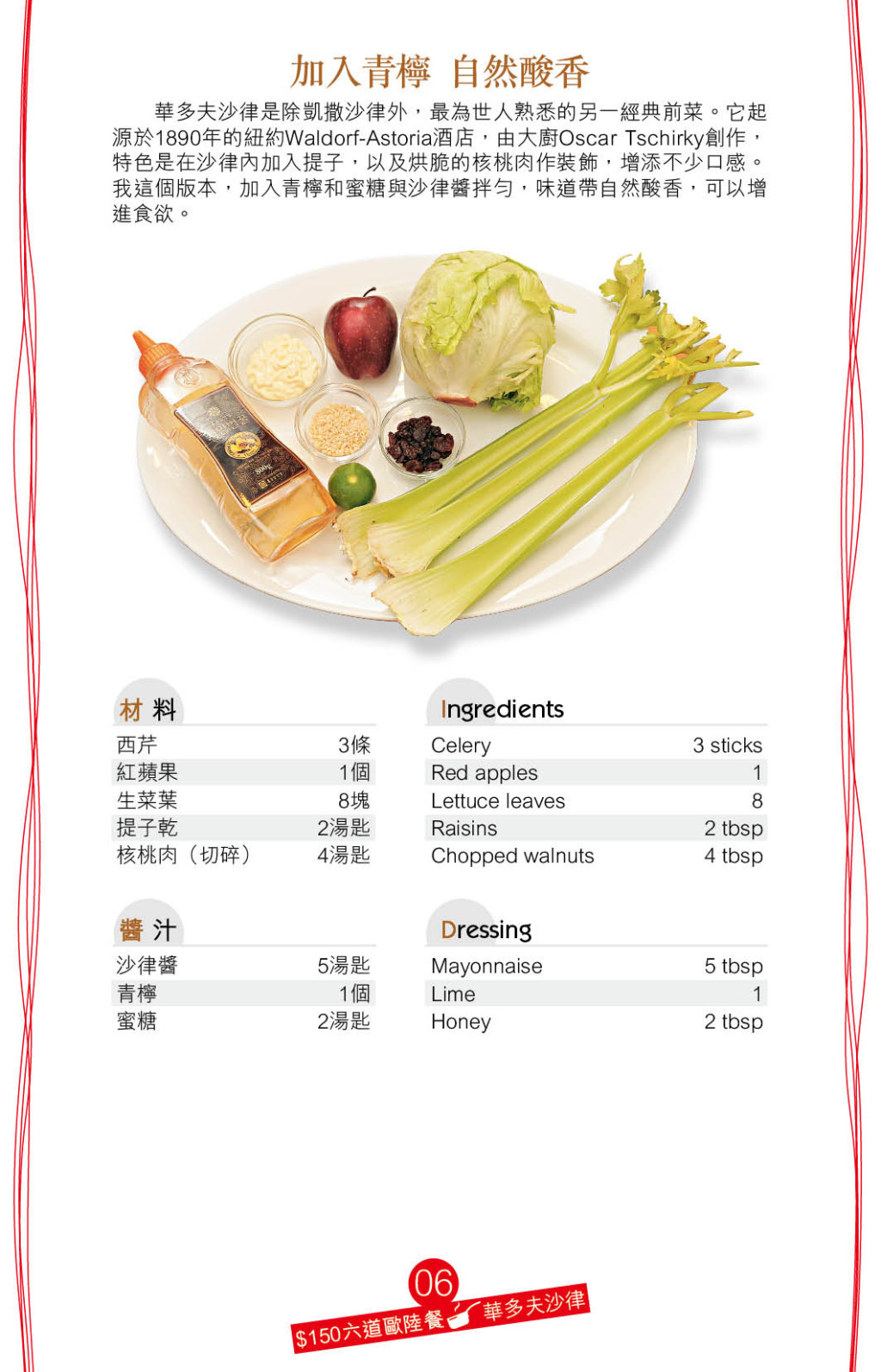 清爽沙律是西餐必備前菜,好像爽口的經典前菜“華多夫沙律”,源自1890年的紐約Waldorf-Astoria酒店,由大廚Oscar Tschirky創作,除了生菜、西芹、蘋果等蔬果外,更加入提子干、烘脆核桃肉增加口感,沙律醬汁則拌入青檸汁及蜜糖添清新香甜味。