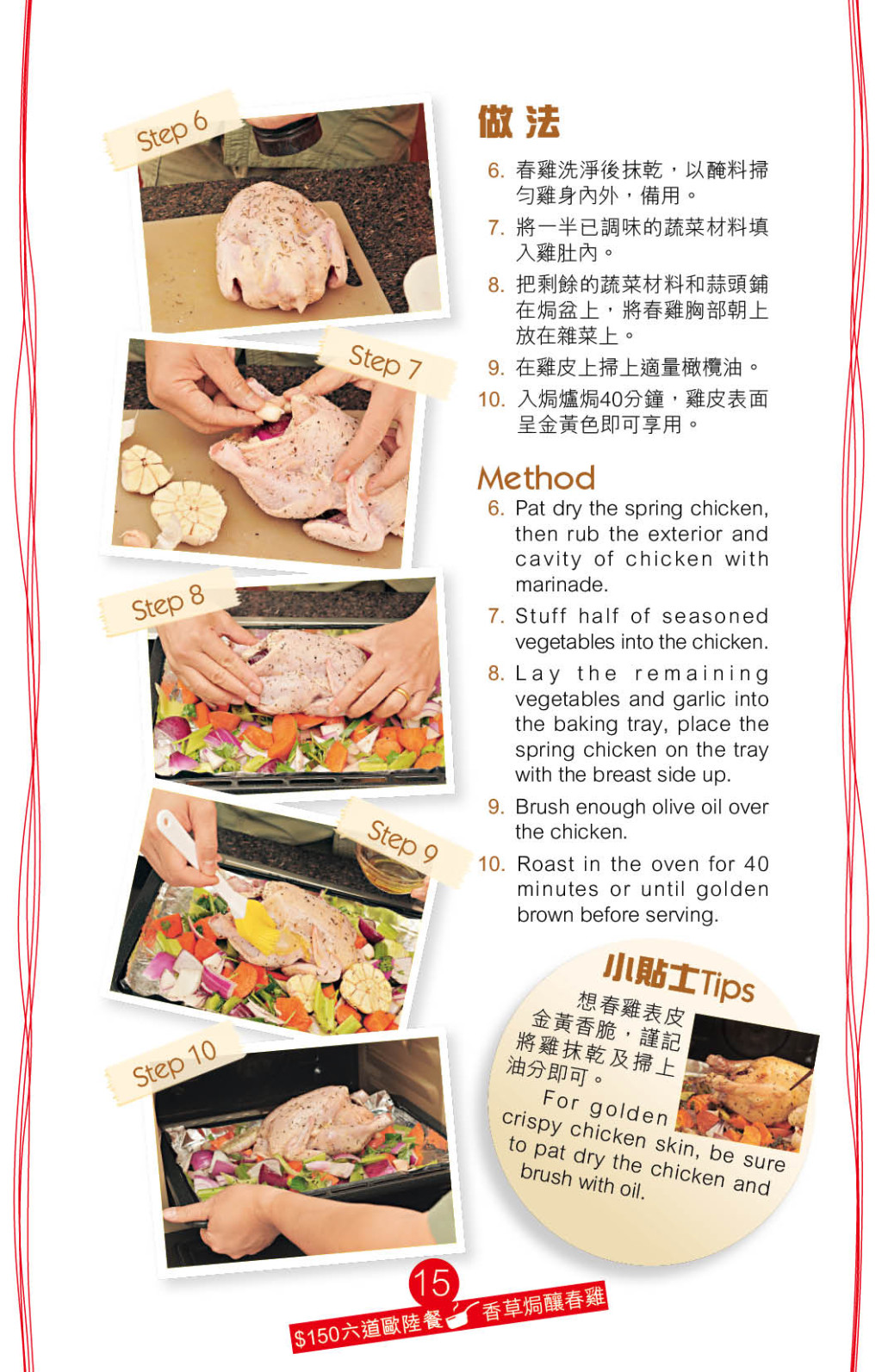 主菜“香草焗釀春雞”的配料豐富,包括原個蒜頭、甘筍、西芹、紅洋蔥、芫荽、青蒜,將所有蔬菜切件,加入香草碎、橄欖油、香草、鹽及胡椒調味后,一半釀入春雞內,另一半放在焗盤,再放上春雞焗至金黃熟透,蔬菜吸收春雞的精華,味道更鮮美。