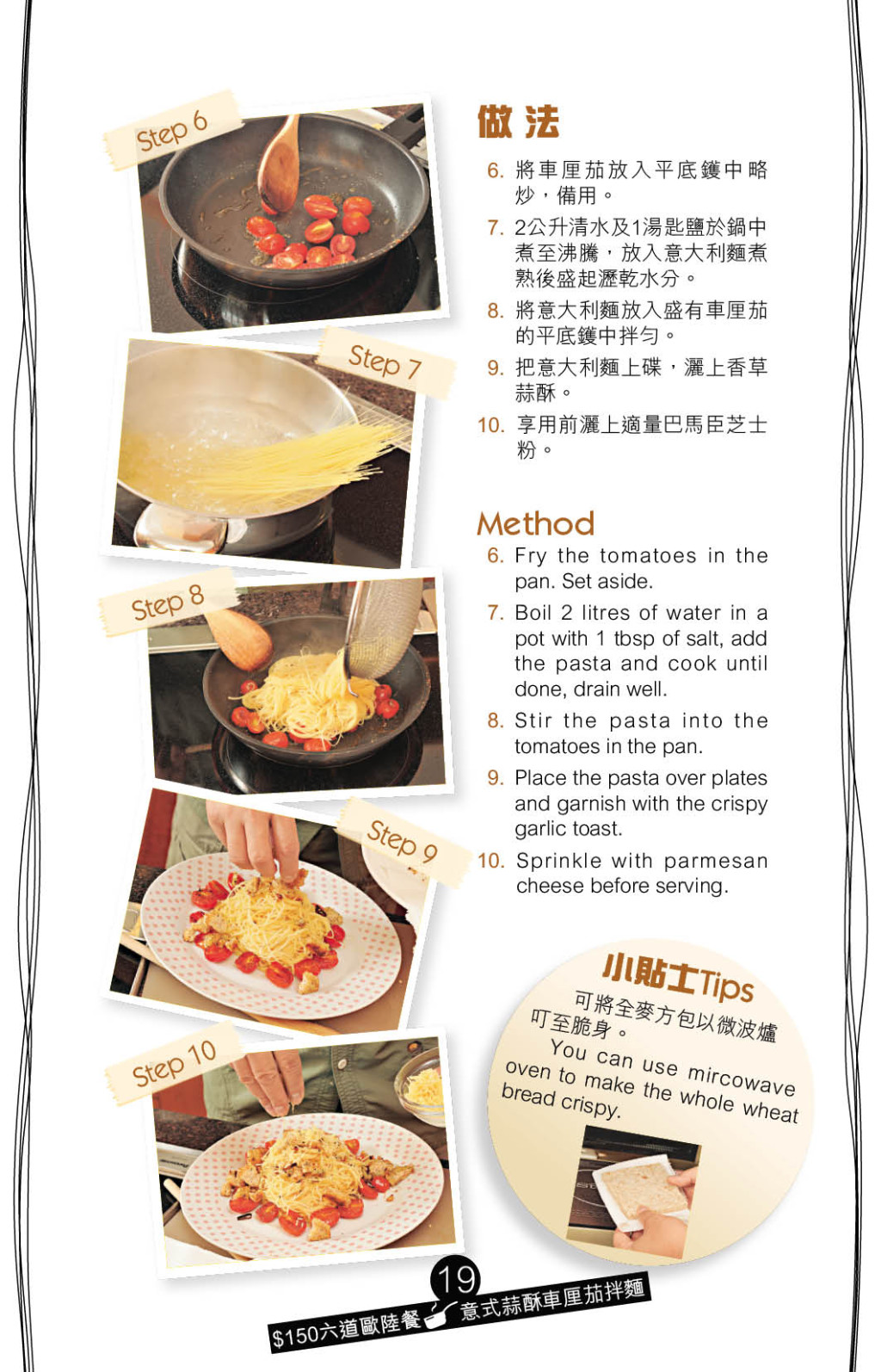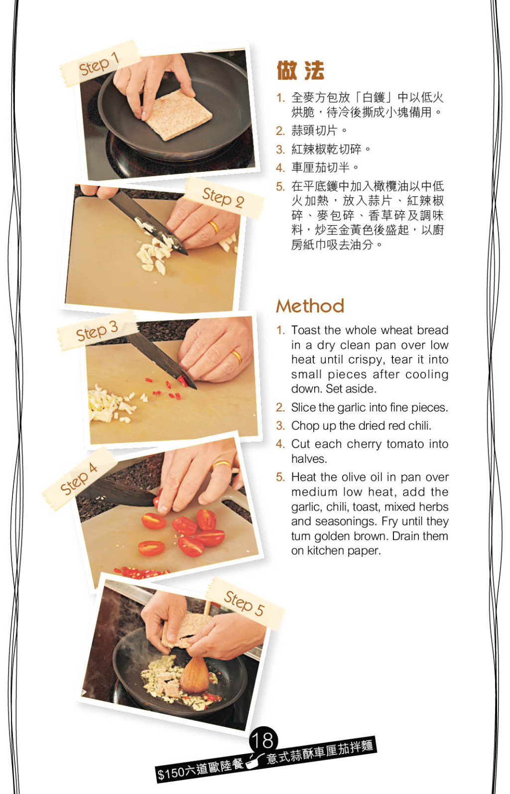 西餐意粉的配搭和烹法千變萬化,今日炮制的“意式蒜酥車厘茄拌面”,重點是用作提味的自制蒜酥,以橄欖油炒香蒜片、紅辣椒碎、烘脆麥包碎、香草碎及調味料,再用廚紙吸去多余油份即可。 意粉拌入巴士臣芝士、車厘茄、紅辣椒干及蒜酥,惹味可口。