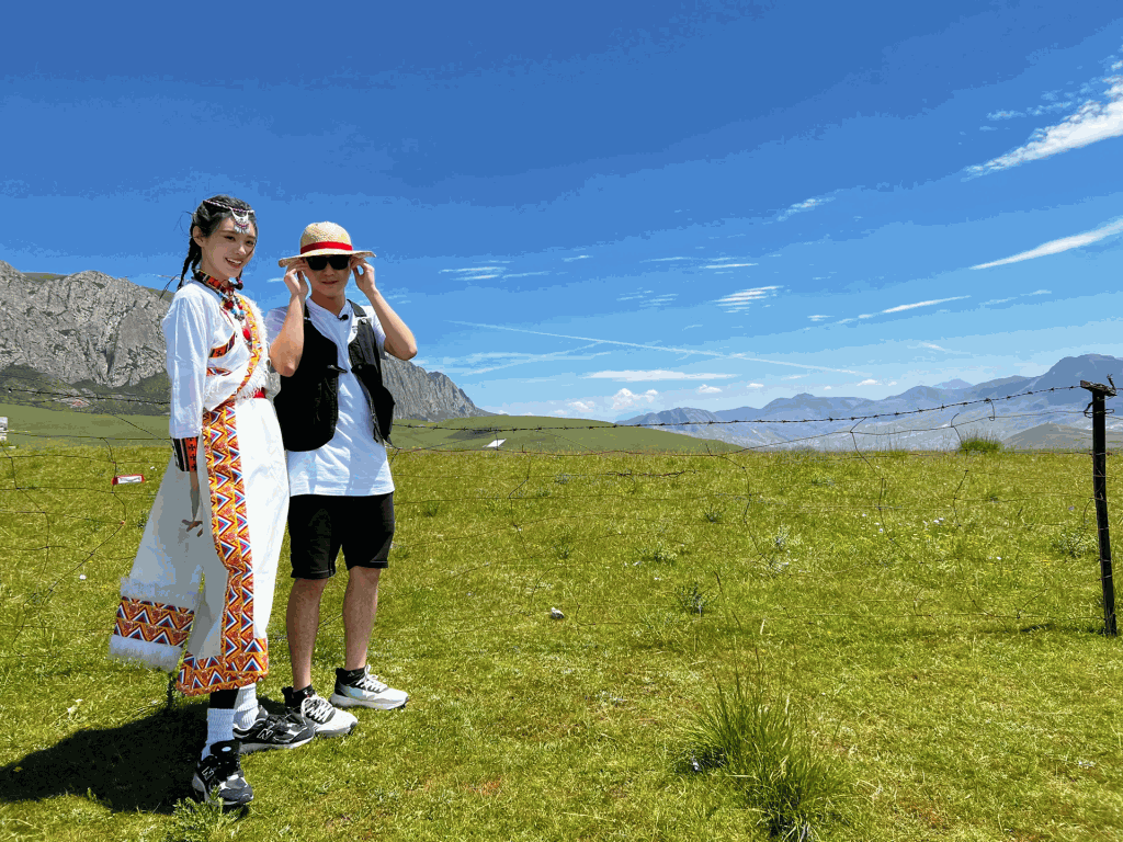 奚夢瑤昨日(19日)在社交網分享與老公拍攝《向山海出發》的照片,身材高?的奚夢瑤身穿白色藏族民族服飾,站在一望無際的草源上,顯得清麗脫俗。不過老公何猷君卻戴上有紅色布條裝飾的草帽,身穿白tee加背心與短褲、波鞋,還戴上太陽眼鏡,卻因為頭上草帽,令他的造型與《海賊王》主角路飛離奇地相似,就連奚夢瑤也留言嘲諷老公:“藏族姑娘與海賊王的日常?!?/strong>