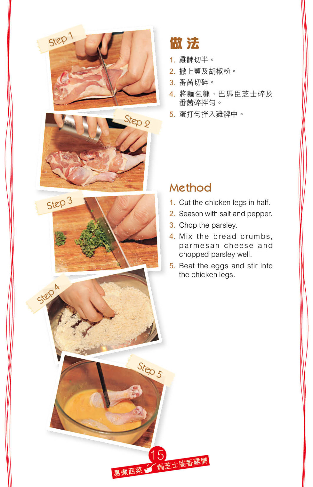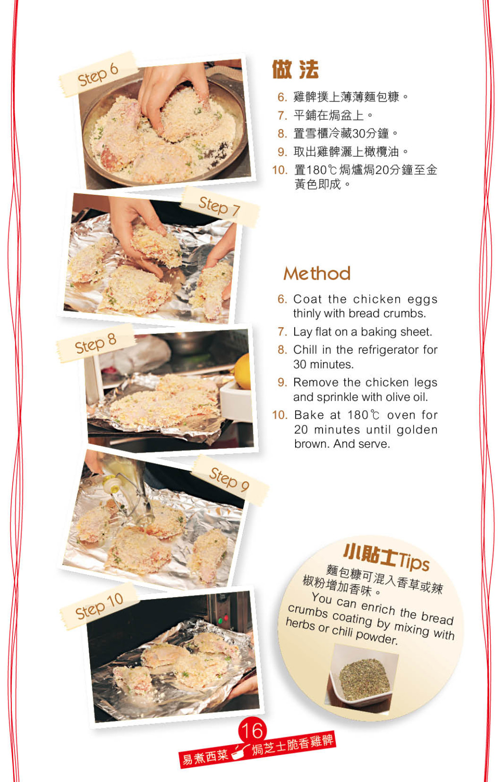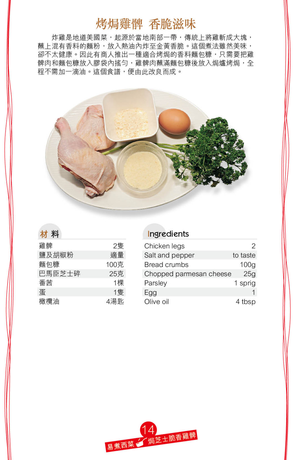 脆卜卜的炸雞腿,美味但略嫌油膩又熱氣,不妨試做“焗芝士脆香雞髀”, 將面包糠、巴臣芝士、番茜碎拌勻,雞腿沾蛋漿及拌好的面包糠,將雞腿放入雪柜半小時冷卻及定形,取出置焗爐烤至外脆內嫩,口感香脆但更健康。