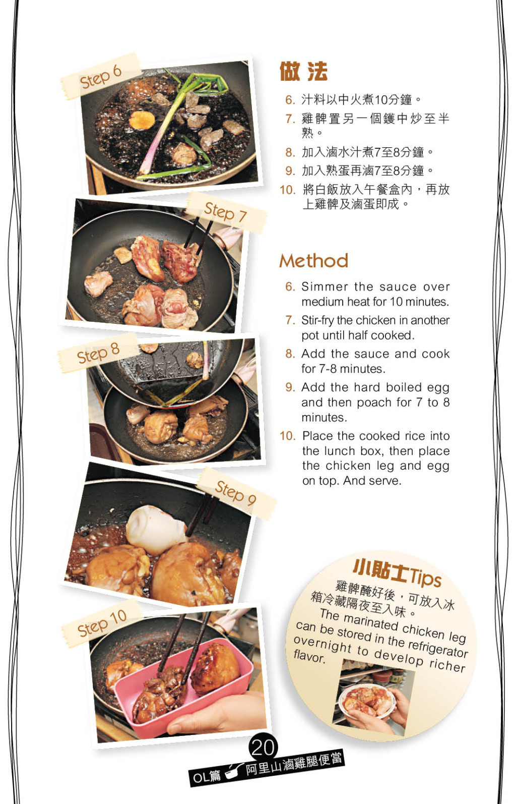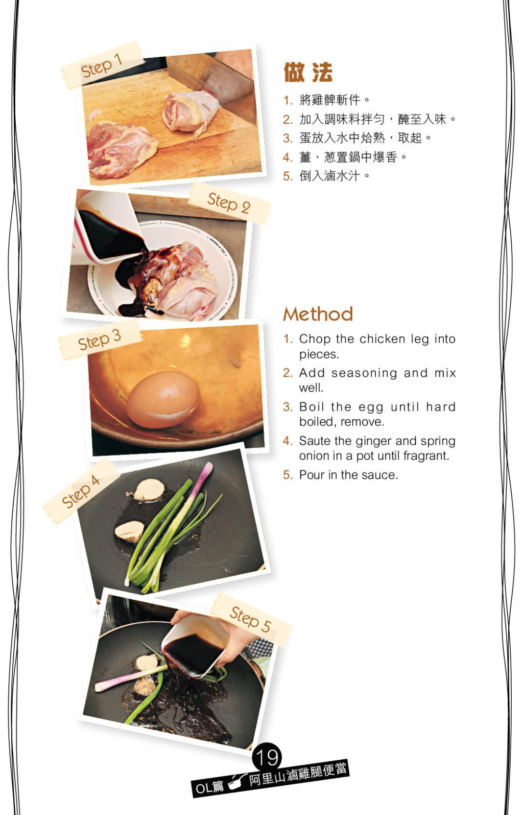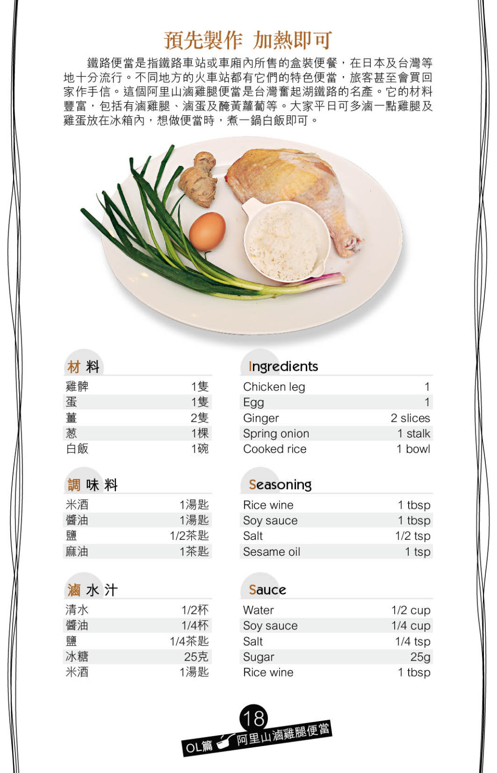 惹味的“阿里山鹵雞腿”,是臺式風味菜。先以清水、醬油、鹽、冰糖、米酒調配鹵汁,起油鑊爆番姜及蔥,加入鹵汁煮滾,先加入雞腿煮數分鐘,再加入烚蛋煮片刻即成,這款鹵水雞腿及雞蛋也適合作為便當菜式。