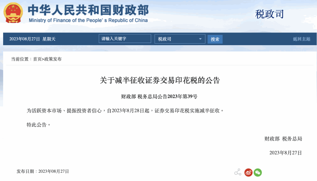 國家財政部及稅務總局刊登公告,由今日(28日)起實施證券交易印花稅減半征收。