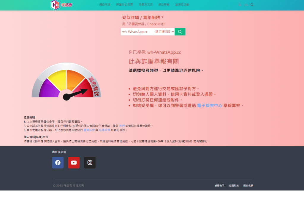 ▲記者輸入wh-WhatsApp.cc,防騙視伏器顯示為“高危有伏”。