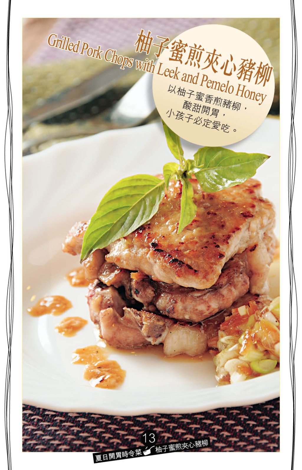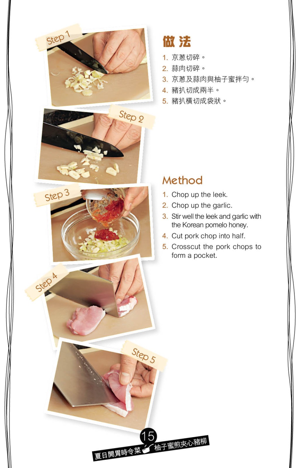 先將豬柳打橫切開造成袋狀,用松肉槌將豬扒捶松,加調味料腌15分鐘,再釀入以京蔥碎、蒜肉及柚子蜜拌勻的醬料。