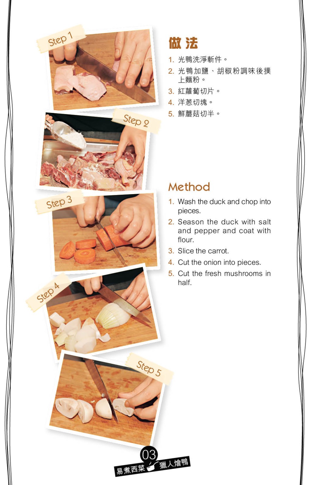 今日推介的西式家常菜“獵人燴鴨”肉嫩惹味,傳統版本的“獵人”醬汁,源自法國古代獵人的烹調野味方法,及后經改良以番茄湯代替肉湯,以雞肉等代替野味。這個家常菜版本的“獵人燴鴨”,以肉味濃郁的鴨肉,配搭紅蘿卜、洋蔥、蘑菇,以罐頭番茄湯燜煮至入味,簡單易煮又好味。