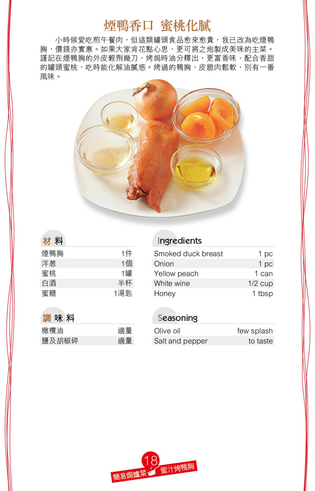 烹調家常菜當然以快捷易煮取勝,其實只要稍加心思,現成的煙鴨胸可變化出不同的美味家常菜。好像“蜜汁烤鴨胸”便是具新意的易煮家常菜。先在煙鴨胸的皮切數刀。將以橄欖油、鹽及胡椒碎拌勻的洋蔥絲放在焗盤,再注入白酒,接著以開邊罐頭桃圍著洋蔥,中間放上鴨胸(鴨皮向上),放入焗爐焗30分鐘,掃上蜜糖再焗香便可。