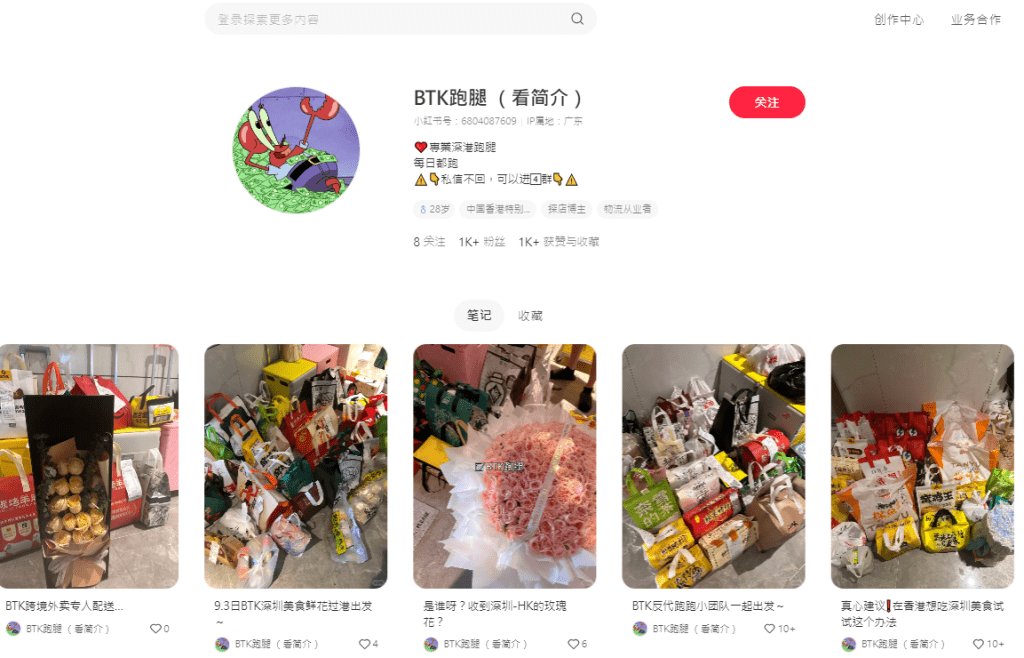 說到深圳香港代購,以往一般是指在香港為客人購貨,再運回內地。時移世易,原來現時更流行反向代購,即在深圳為客人代購各種日常貨品及食物等,再送回香港,賺取代購費。其中一位在小紅書網名為“BTK跑腿”的帖主,便自稱經營深圳香港反向代購已半年,“真心建議,在香港想吃深圳美食,試試這個辦法”、“香港賺錢深圳花”,她說每日多次往返深港,且不限次數,代購貨品包括美食、鮮花、文件、落下的物品,以至可為客人接一對一訂單,包辦團餐、家庭聚餐party及下午茶美食等,且全港皆送貨,對于吃慣或用慣內地美食或貨品者,不想舟車勞頓親身上去深圳而委托代購者作反向代購,也確是不錯方法。
