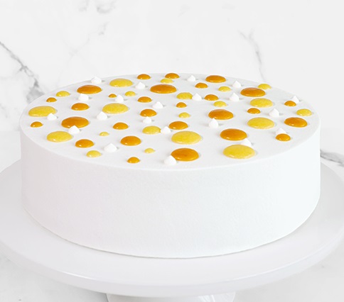 芒果海綿蛋糕(件裝 $68、原個蛋糕9吋 $680),造型清雅簡約,白色淡忌廉佐橙黃果泥及海綿蛋糕,簡單又美味。