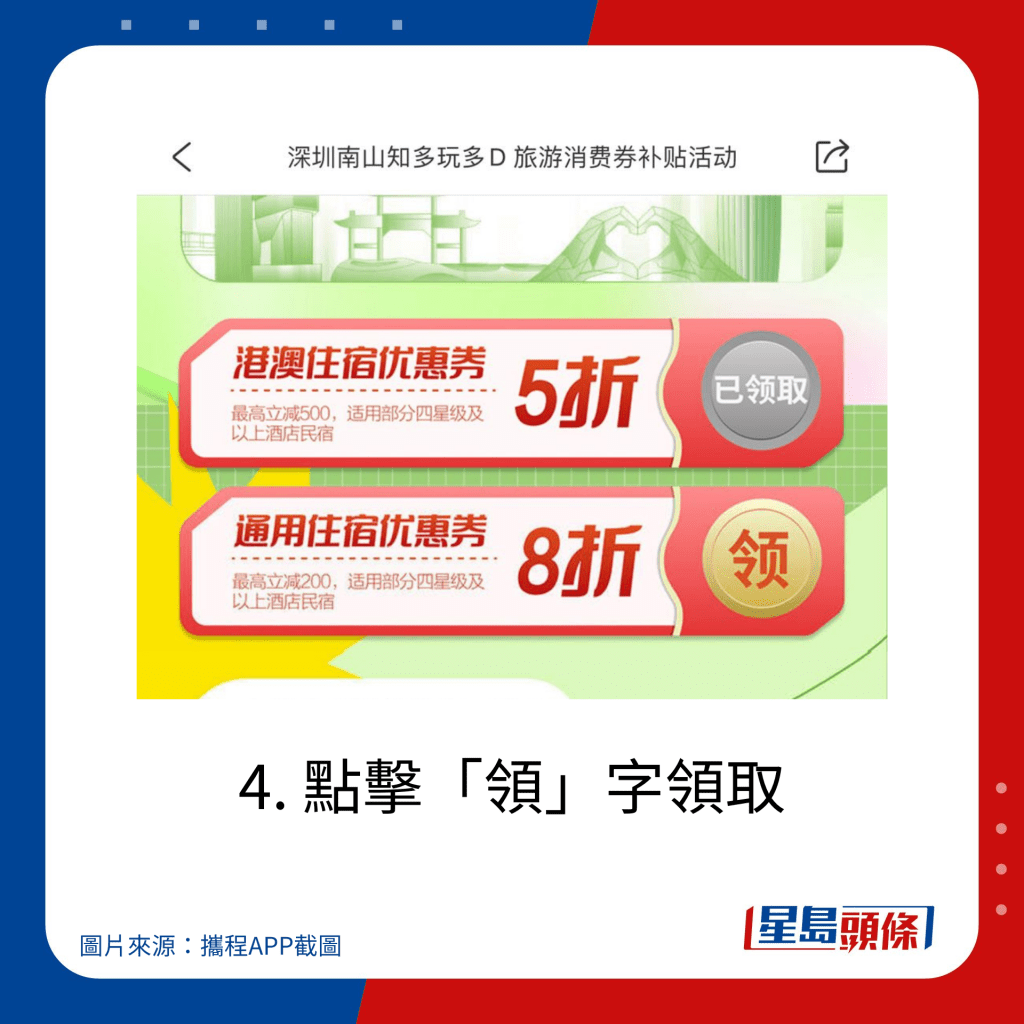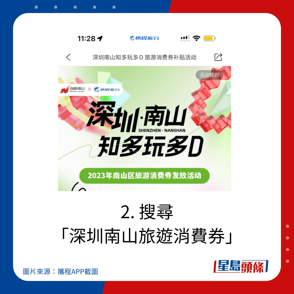 攜程一共發放兩張酒店民宿消費券,其中一張“港澳定向住宿優惠券”,讓位于香港的攜程登錄用戶發放,可適用于深圳市南山區指定的酒店及民宿,部分酒店達四星級及以上,優惠最高可達5折,最高立減 ¥500。另一張“通用文旅住宿優惠券”可適用于深圳市南山區指定的飯店及民宿,部分四星級及以上產品,優惠最高可達8折,最多可減 ¥200。