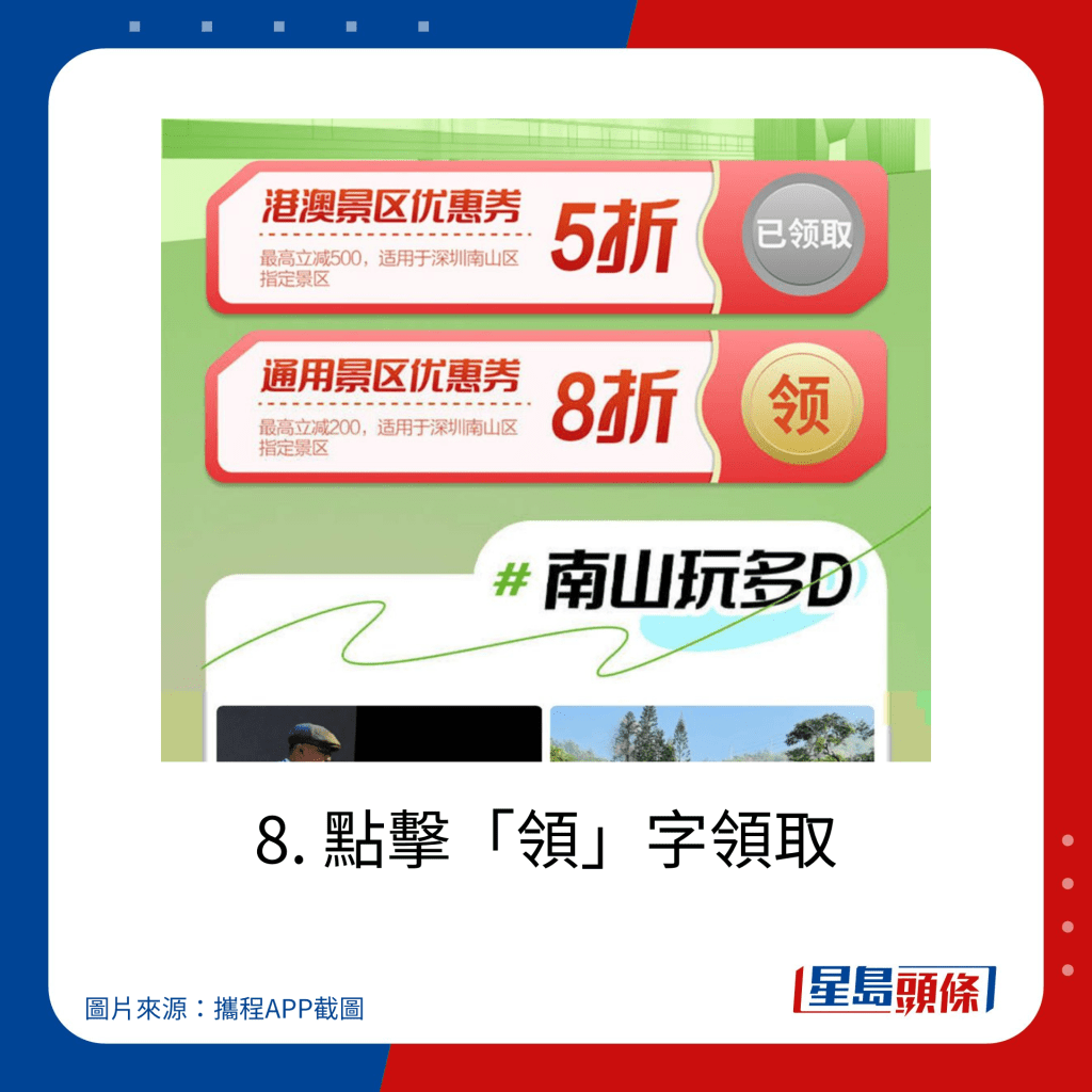 分為“港澳定向度假優惠券”及“通用文旅住宿優惠券”?!案郯亩ㄏ蚨燃賰灮萑毕蝾I券時位于香港及澳門區域的攜程登錄用戶定向發放旅游惠民補貼,適用于含1晚深圳市南山區住宿或景點的指定度假線路產品,折扣高達 5折優惠 ,最高立減 ¥500?!巴ㄓ梦穆米∷迌灮萑边m用于含1晚深圳市南山區住宿或景點的指定度假線路產品,折扣為8折,最高立減¥300。
