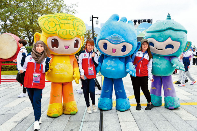 ▲馬來西亞選手同亞運吉祥物“琮琮”、“宸宸”、“蓮蓮”合影。