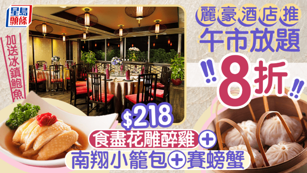 麗豪酒店龍門客棧推出快閃限量8折午市點心自助,低至$218便可以任食2小時的京滬淮陽菜,包括南翔小籠包、蟲草花鮮雞湯等逾 40 款點心、湯羹、小炒、主食、甜品美食,更額外加送冰鎮鮮鮑魚,立即查看以下優惠詳情。