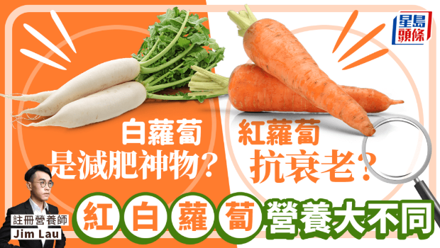 紅蘿卜、白蘿卜除了屬性不同,一個平性,一個寒涼,營養及功效也不同!注冊營養師Jim Lau表示,白蘿卜為減肥神器,而紅蘿卜則是天然的綜合維他命。到底是什么原因?哪種蘿卜更有營養?