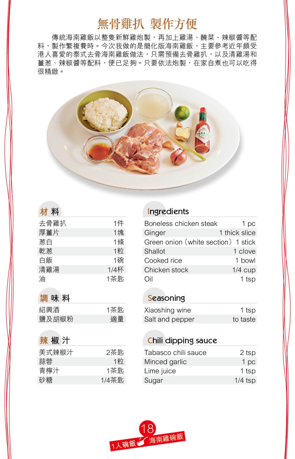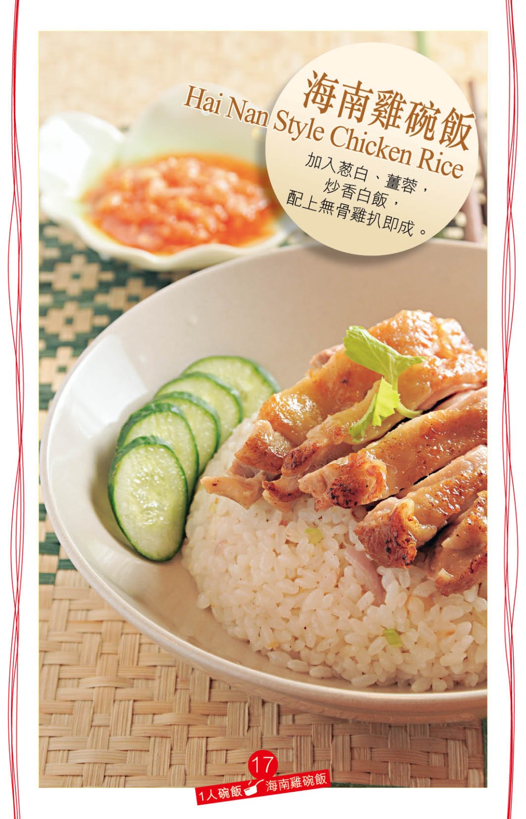 鮮味的海南雞碗飯,做法亦不復雜。 先調配蘸汁,將美式辣椒汁、蒜蓉、青檸汁、砂糖及姜蓉混合,備用。 雞扒用紹興酒、糖、胡椒粉腌至入味,再煎熟。 爆香蔥白、干蔥、姜蓉,加入白飯炒勻,注入清雞湯煮至收汁。 將煎香的雞扒切件,放在有味飯上,伴辣椒汁品嘗。